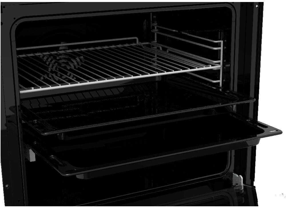 - Объем 76 л позволяет готовить крупные блюда (например, торты или индейку), а глубокие противни (2 шт. в комплекте) предотвращают вытекание соков.