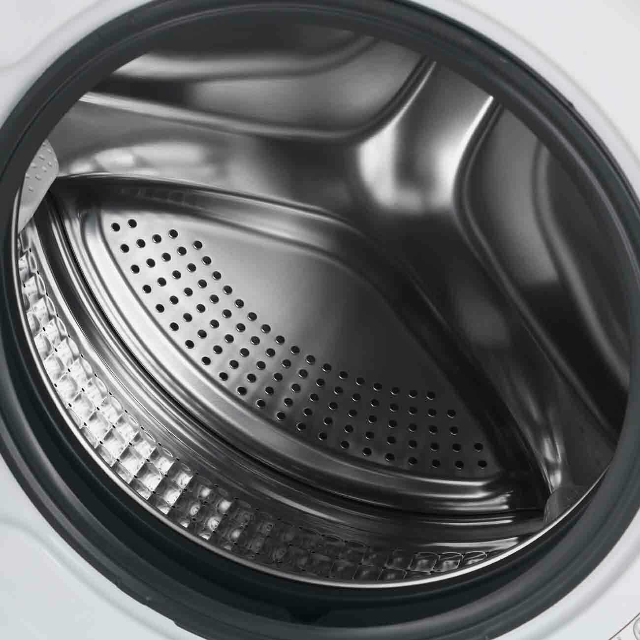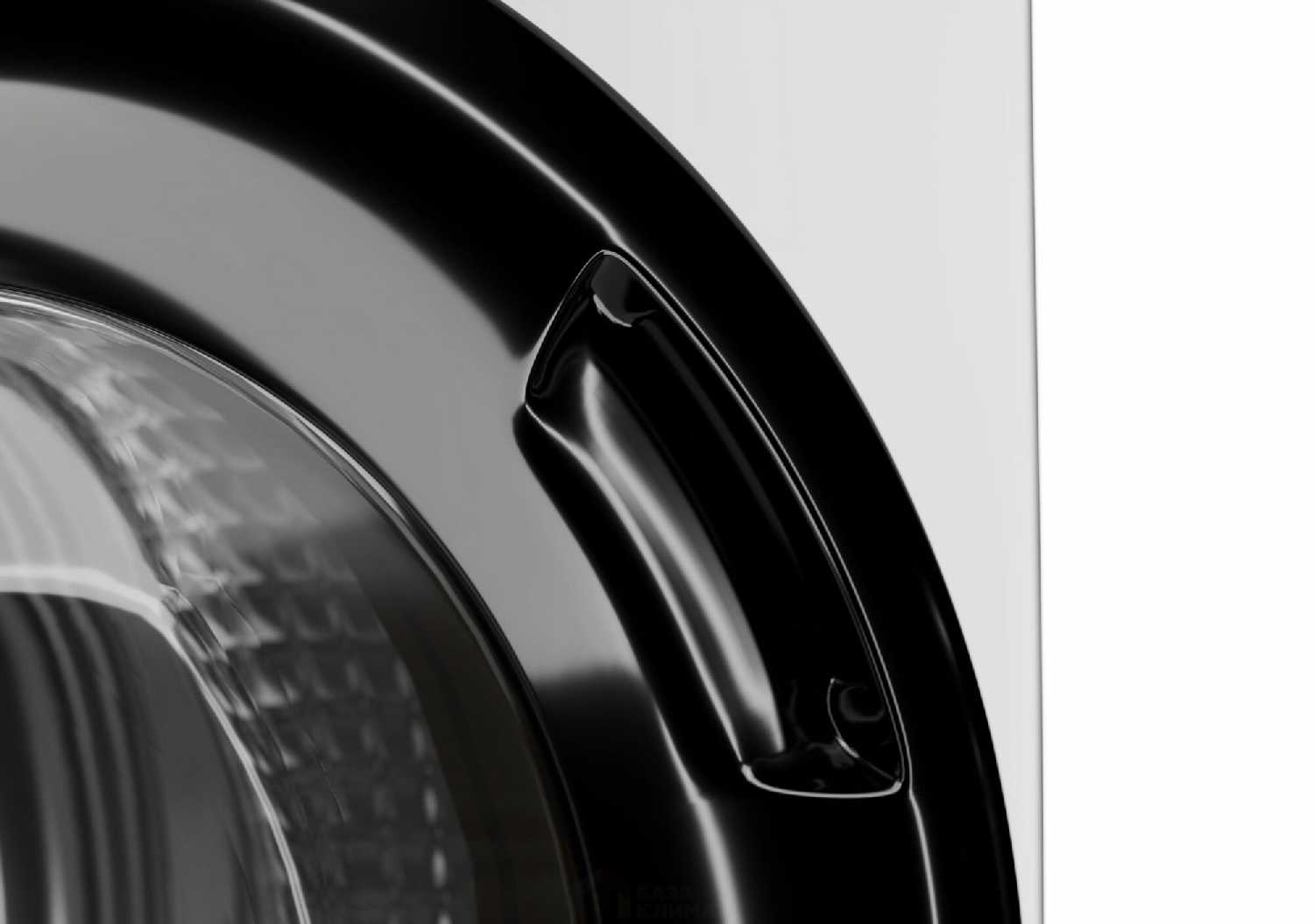 Красивая и умная стиральная машинка. Доступный функционал и понятное управление. Стиральная машинка и панель управления белого цвета, цифры и надписи с LED подсветкой синего цвета, видно хорошо.