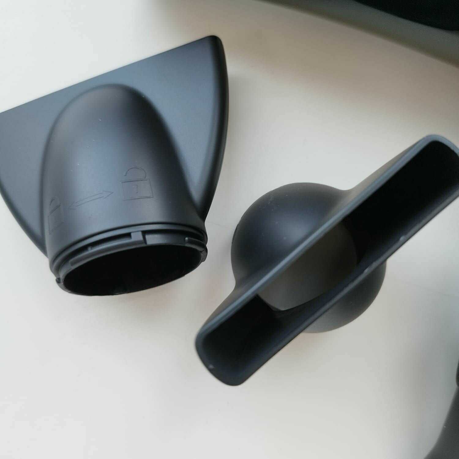 - - Достаточно крупные насадки, в стандартное кольцо для подвески на стену не пролазят. При хранении фена на крючке возникает проблема куда деть (где хранить) насадки.