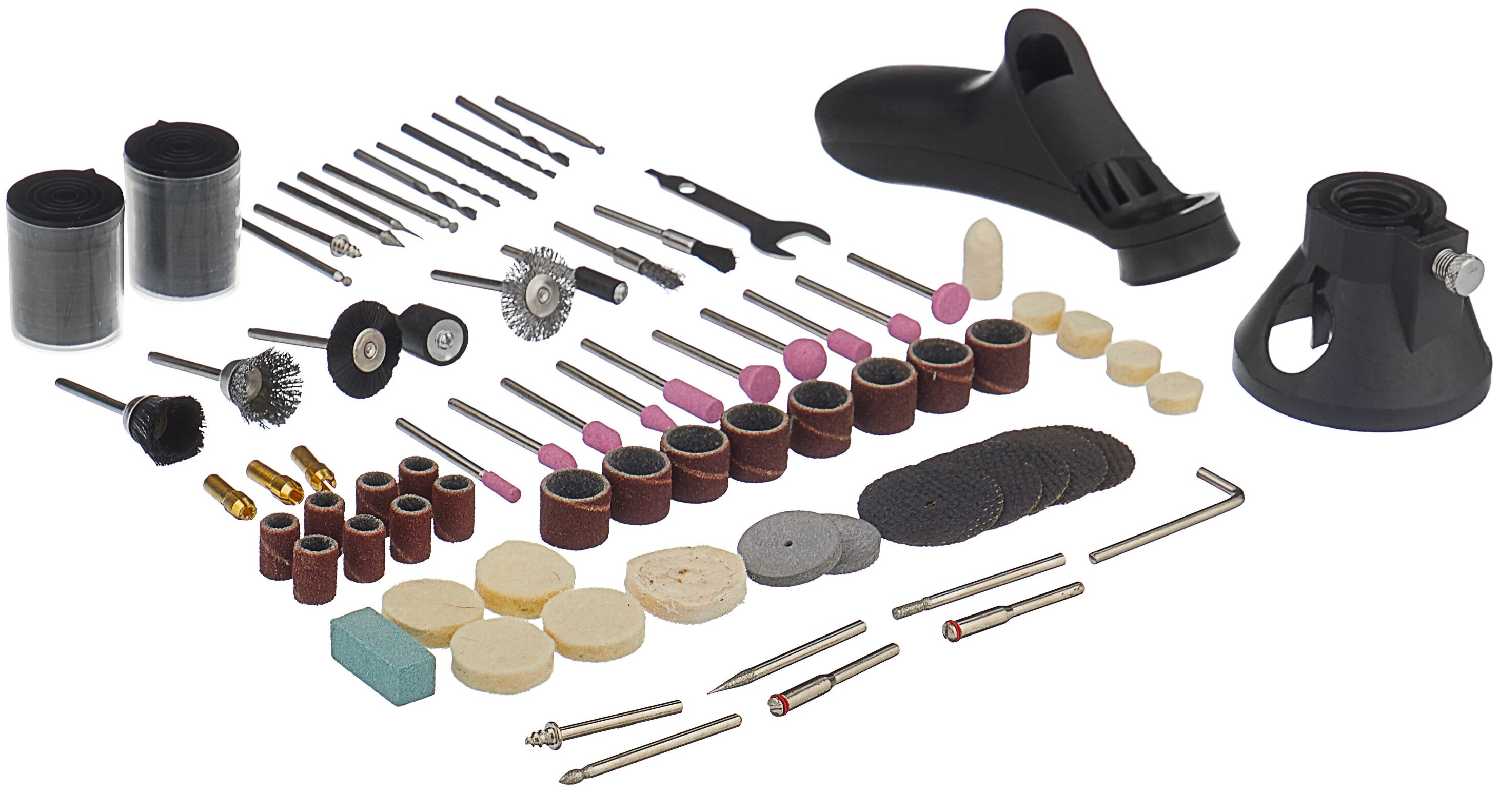 | Комплектация : | кронштейн, гибкий вал, сумка, насадка фрезеровальная, ключи - 2 шт, боры шлифовальные - 10 шт, круги отрезные - 66 шт, круги отрезные усиленные - 5 шт, боры алмазные - 7 шт, бор гравироваьный - 1 шт, цанги - 4 шт, сверло-фреза - 1 шт, сверла - 4 шт, держатель полировальных кругов - 2 шт, держатель отрезных кругов - 2 шт, держатель наждачных цилиндров - 2 шт, кордщётки проволочные - 3 шт, кордщётки полировальные - 3 шт, цилиндры наждачные - 16 шт, точильный камень - 1 шт, круг абразивный -2 шт, полировальные насадки - 11 шт, круг шлифовальный - 20 шт |