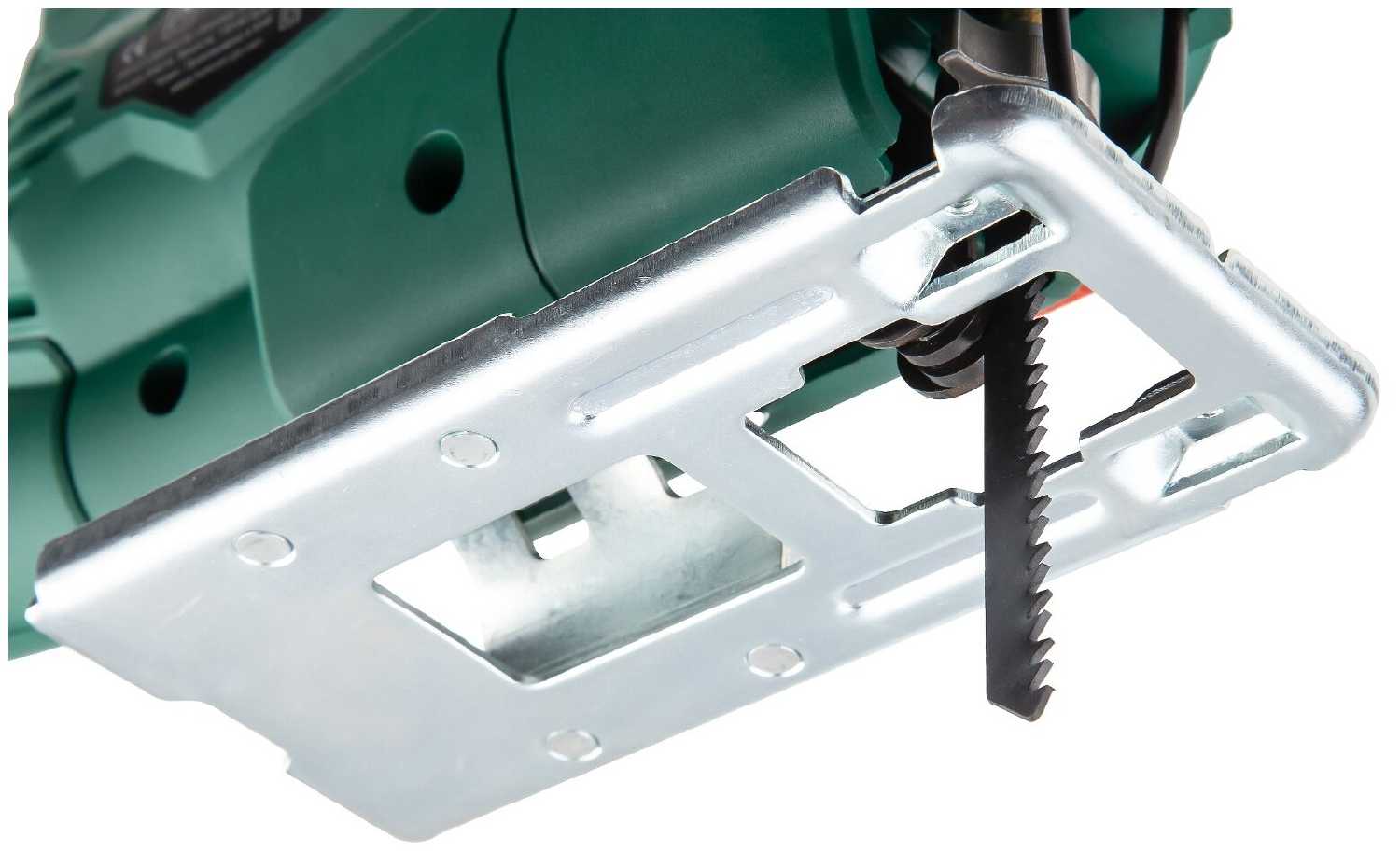 - Колодочное Т-образное крепление позволяет вставлять пилки без инструментов, сокращая время подготовки для разных материалов, как дерево или металл.