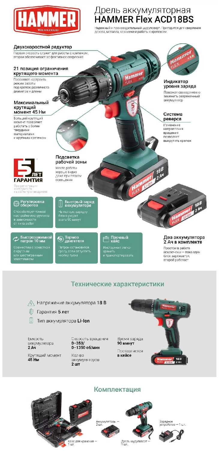 Отзывы о Аккумуляторная дрель-шуруповерт Hammerflex ACD18BS