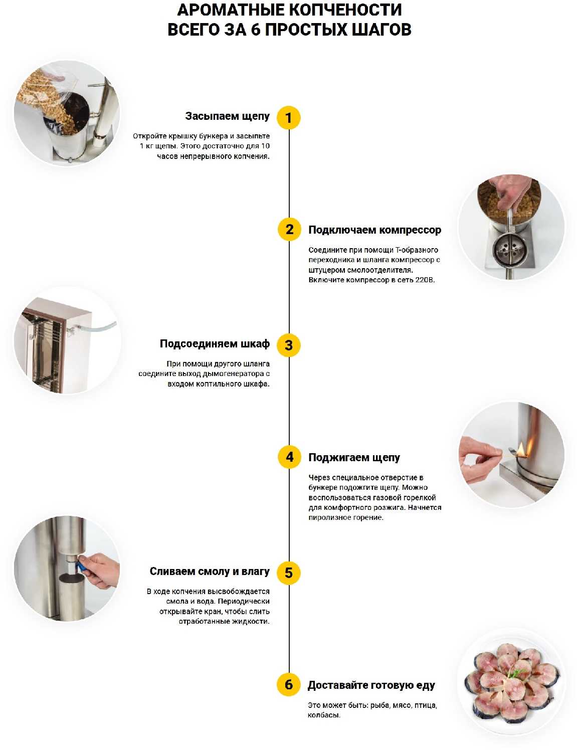 - В комплекте идут два пакета щепы (0.4 кг каждый), шланги и брошюра с рецептами, что позволяет начать копчение сразу после сборки.
