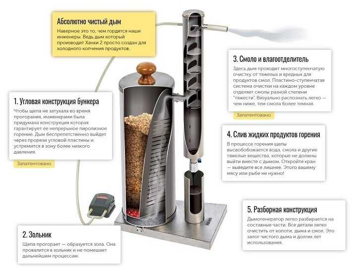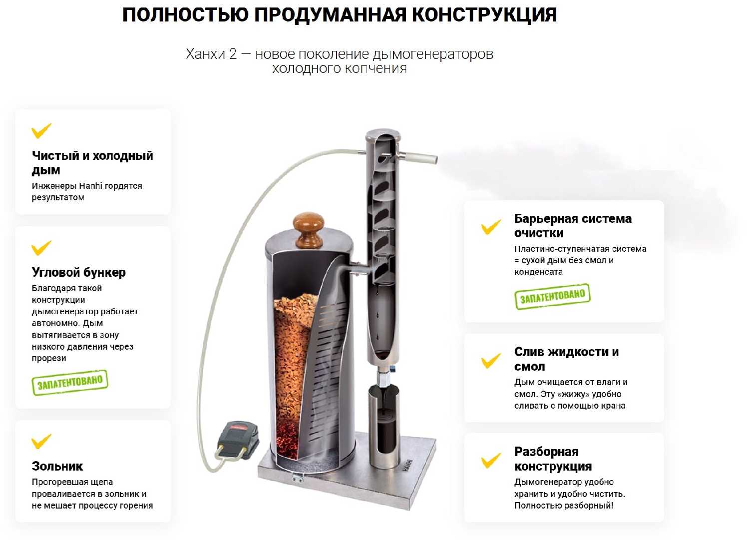 - Лепестковый дымоохладитель и лабиринтная система задерживают смолу, предотвращая её попадание на продукты.
