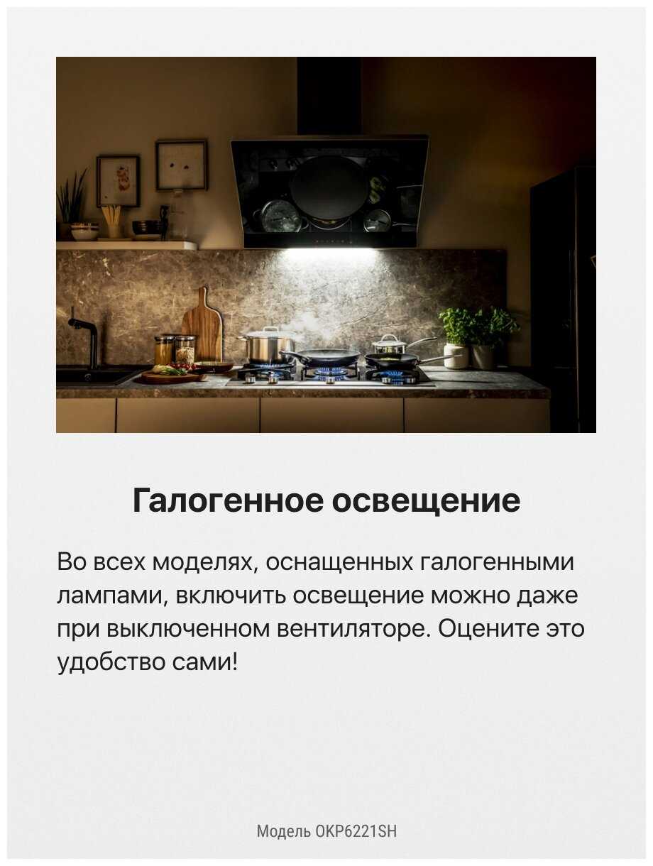 - Галогеновые или светодиодные лампы (2x20 Вт) дают ровный яркий свет на варочную поверхность.