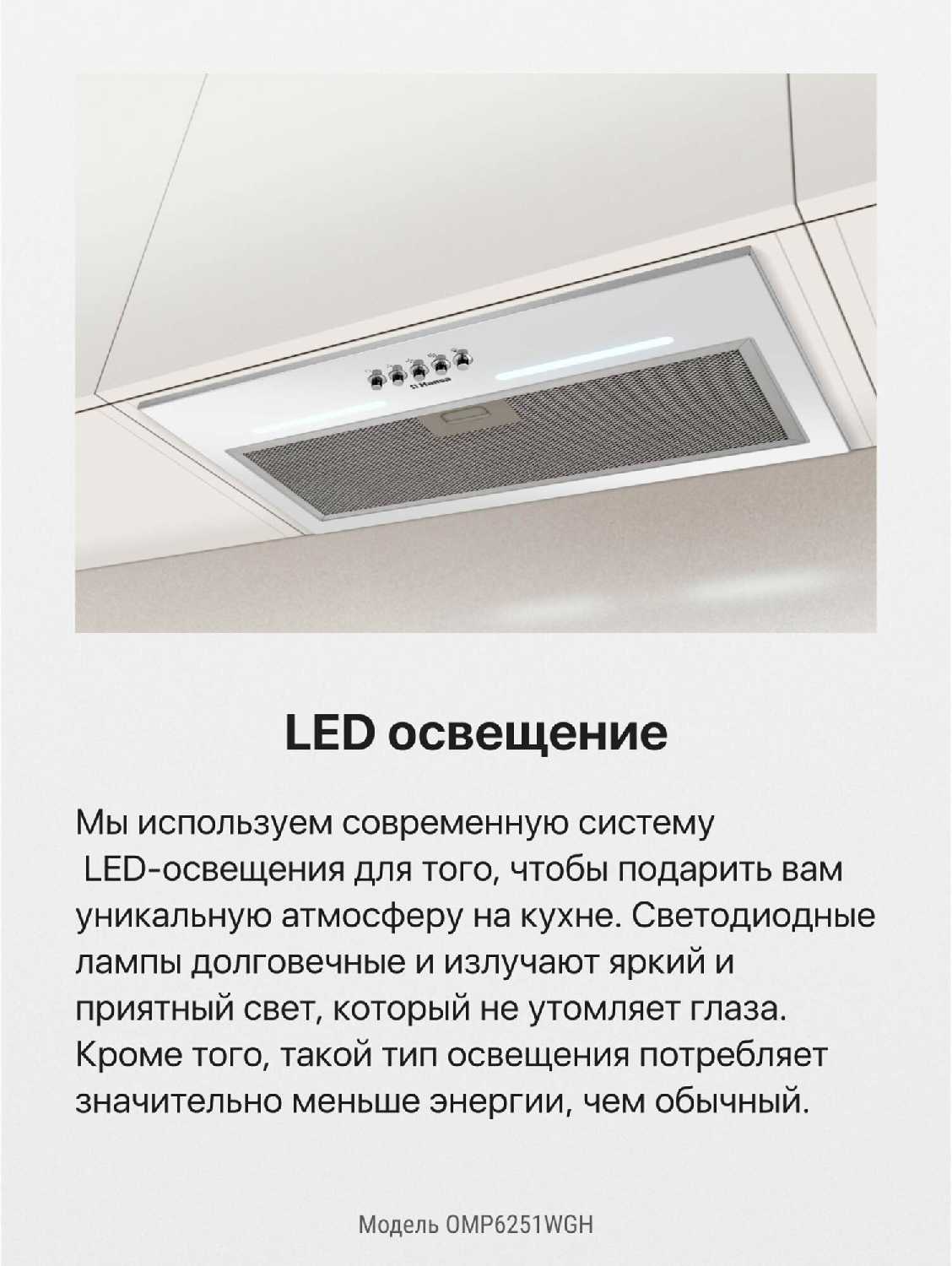 Очень красивая внешне. Очень просто мыть поверхность (стекло). Подсветка находится ближе к краю варочной поверхности, что значительно увеличивает зону освещения в отличие от той которая ближе к стене + led свет крутой. Вытягивает очень хорошо даже на первой скорости.