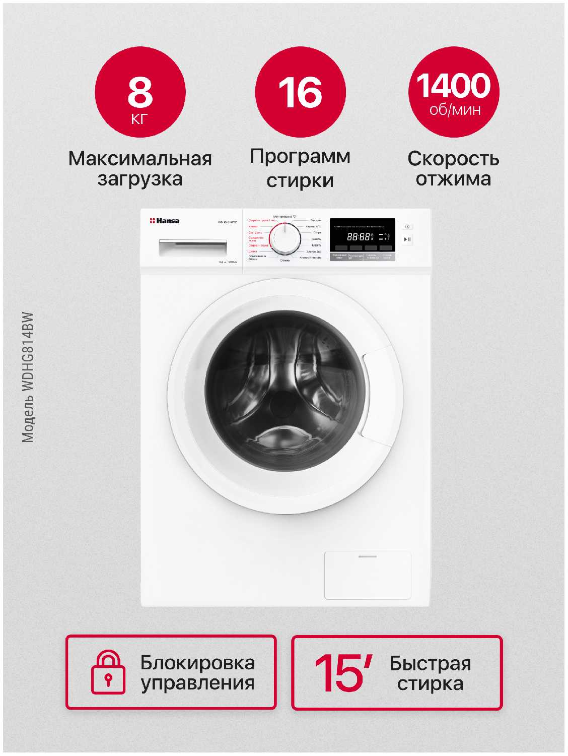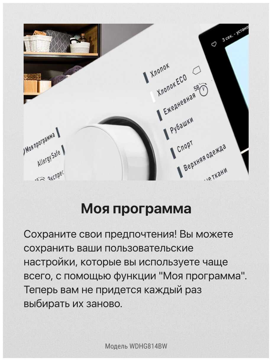 программы: хлопок хлопок ECO синтетика шерсть mix спорт быстрая стирка моя программа сушка белья, блокировка управления защитная крышка люка самодиагностика неисправностей контроль над перепадами напряжения контроль перелива воды контроль дисбаланса контроль пенообразования защитная блокировка люка отмена отжима разборный бак