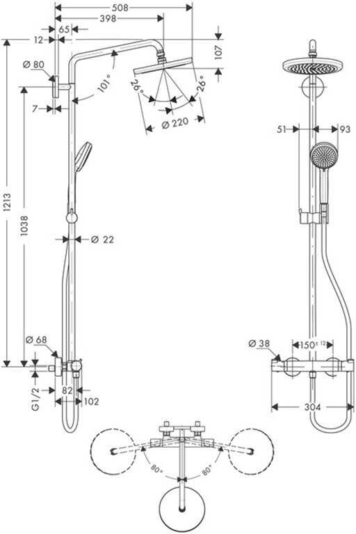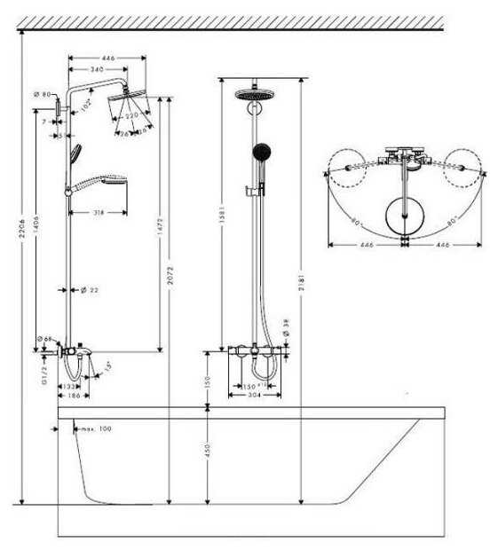 режимы потока воды от производителя: rain rainair shampoo струя massage jet normal, высота стойки для душа: 1581 мм, диаметр душевой лейки: 100 мм, диаметр верхнего душа: 220 мм