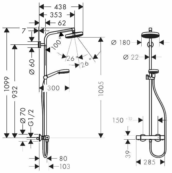 | Дополнительная информация : | покрытие белый/хром, высота стойки для душа: 1099 мм, диаметр душевой лейки: 100 мм, диаметр верхнего душа: 160 мм |