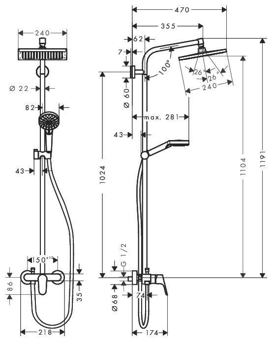 | Дополнительная информация : | высота стойки для душа: 1191 мм, диаметр душевой лейки: 100 мм, длина верхнего душа: 240 мм, ширина верхнего душа: 240 мм, регулируемый по высоте держатель ручного душа |