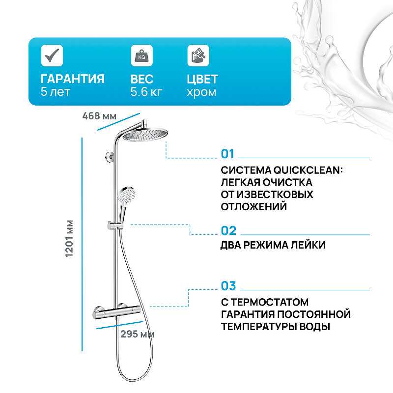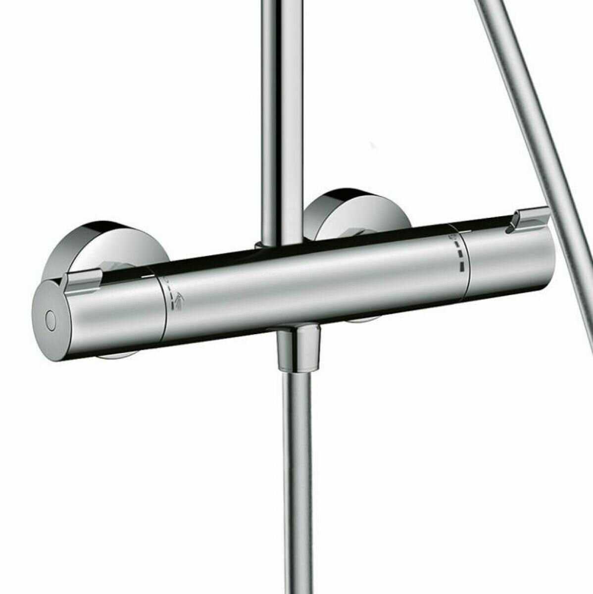 На момент покупки один из самых доступных термостатических душевых гарнитуров hansgrohe. Температуру держит стабильно, не будет зависеть от постоянных перепадав давления