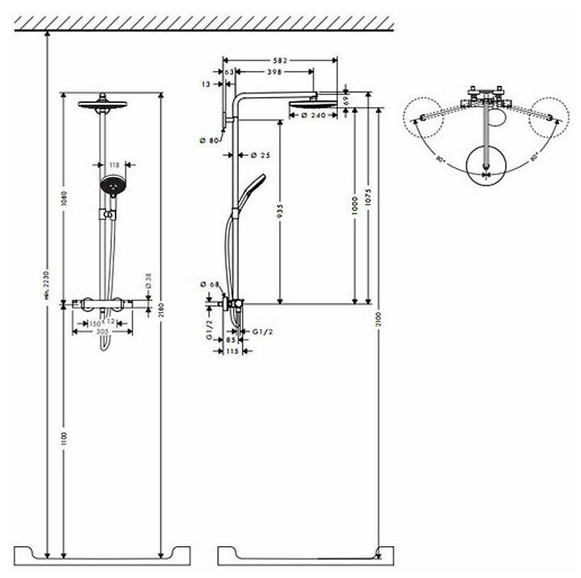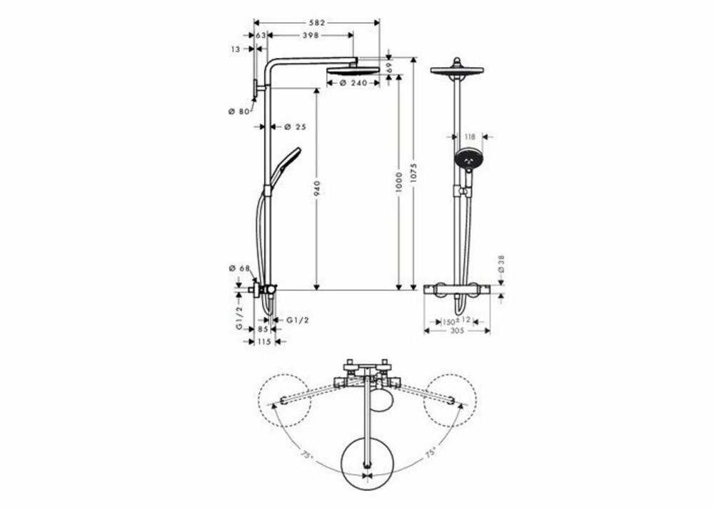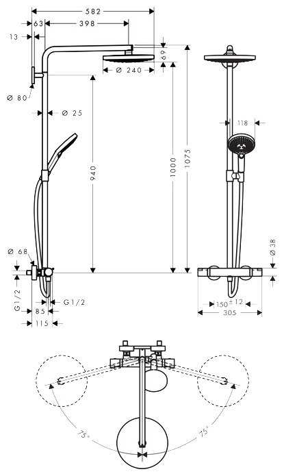 Дополнительная информация : | высота стойки для душа: 1075 мм, диаметр душевой лейки: 120 мм, диаметр верхнего душа: 240 мм |