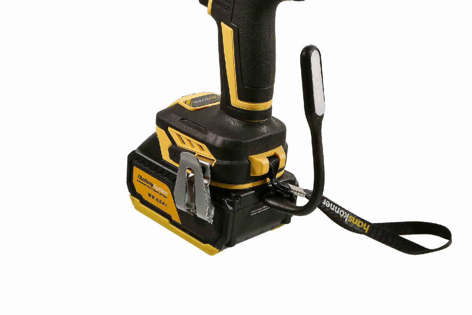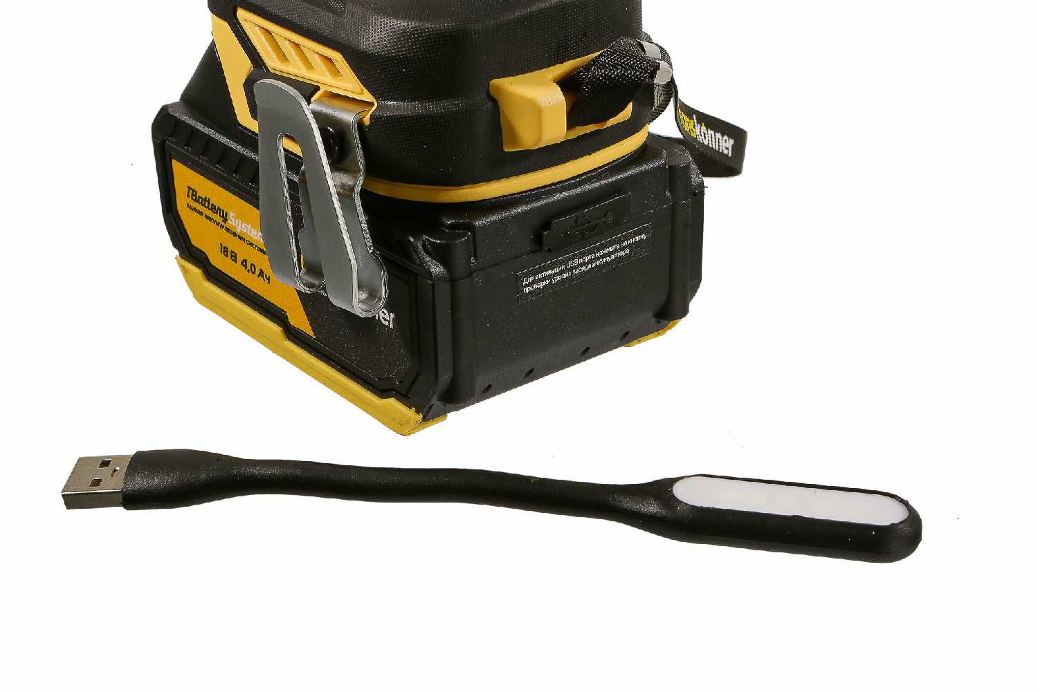 В комплекте присутствует небольшой фонарик, который подключается к батарее шуруповёрта в гнездо USB.