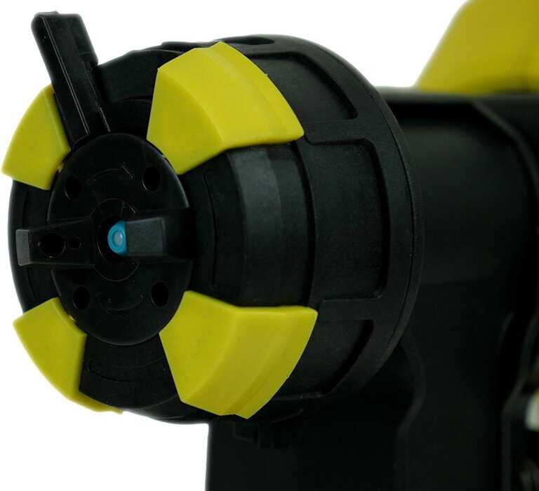 - Поворотный механизм на корпусе позволяет переключать между вертикальным и горизонтальным распылением, адаптируя под потолки или стены для равномерного слоя без полос.