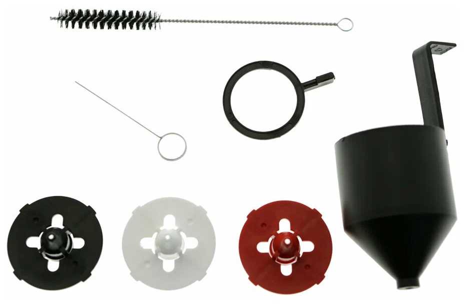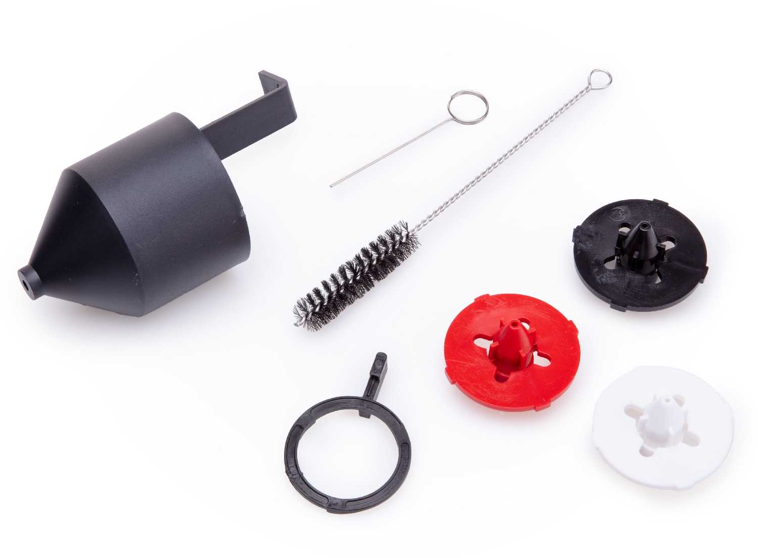 В стандартную комплектацию входят 4 сменные форсунки разных диаметров, что позволяет работать с материалами различной вязкости. Наличие нескольких насадок обеспечивает универсальность инструмента для разных типов работ — от тонкого распыления до покрытия больших площадей широким факелом. -