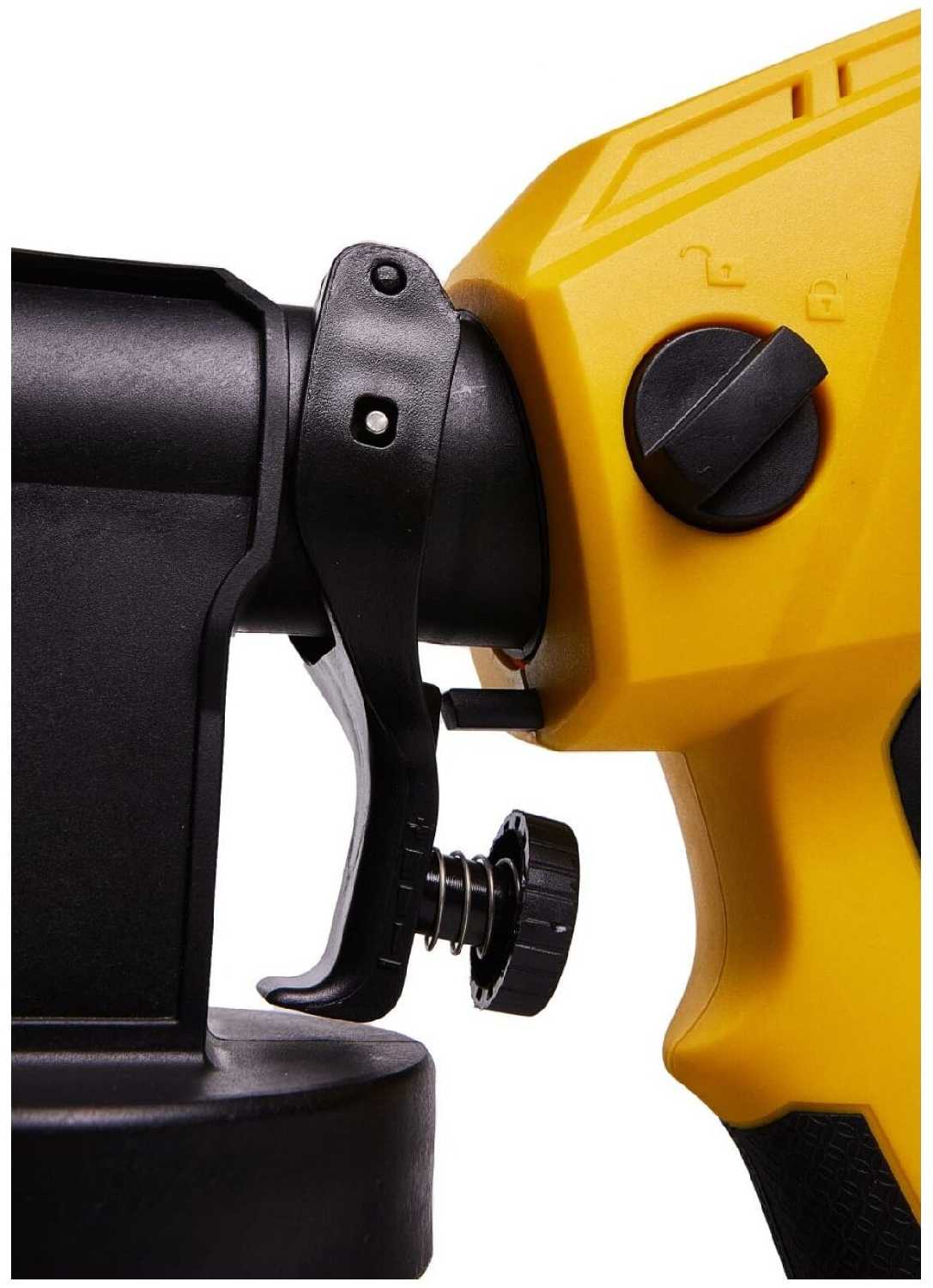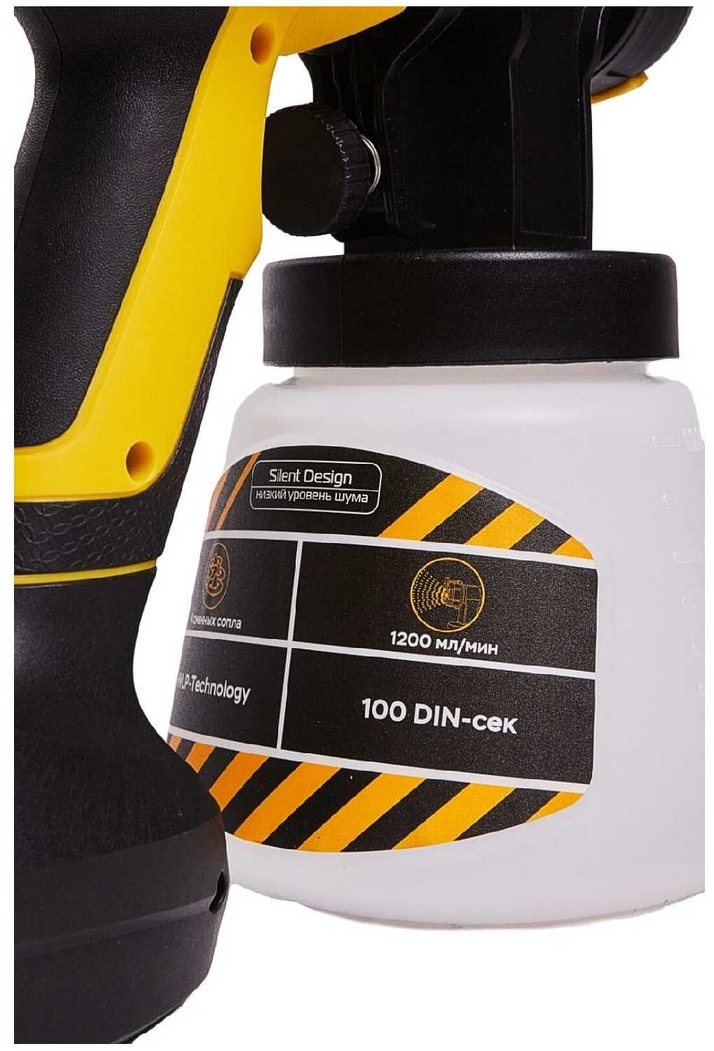 Конструктивные особенности и эргономика Ключевое преимущество — поворотный механизм регулировки подачи прямо на корпусе, упрощающий оперативную корректировку. Объемный бак (точный объем не указан, но отмечен как "достаточный") снижает частоту дозаправок. В комплекте 4 сменные форсунки разного диаметра для работы с различными материалами. Прорезиненная рукоять и продуманная балансировка облегчают удержание, хотя вес аппарата с полным бачком вызывает усталость при длительной работе ("плечи чувствуют через час"). Длина шнура (4 метра) исключает необходимость удлинителя в стандартных помещениях.