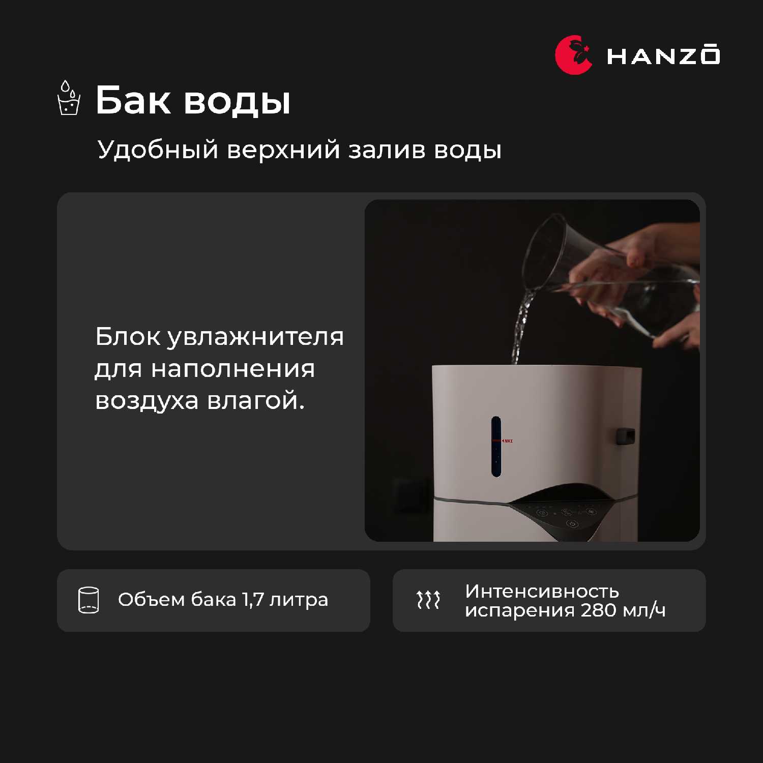 Блок увлажнения стала использовать, когда включили отопление. Тоже осталось крайне довольна. В сравнении с бюджетными увлажнителями, которые струей выпускают пар, и в помещении становится просто сауна, Hanzo увалажняет воздух ооооочень деликатно и мягко. Нет мокрого налета на мебели и полу.
