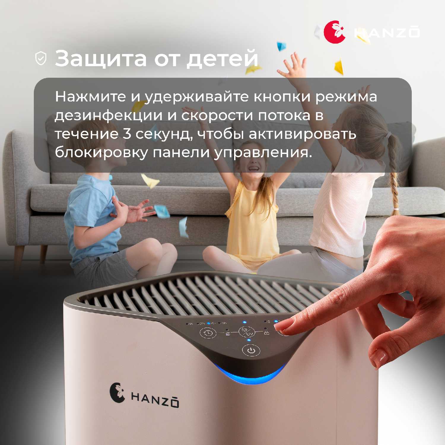 - Сенсорная панель управления и блокировка кнопок предотвращают случайное изменение настроек детьми.