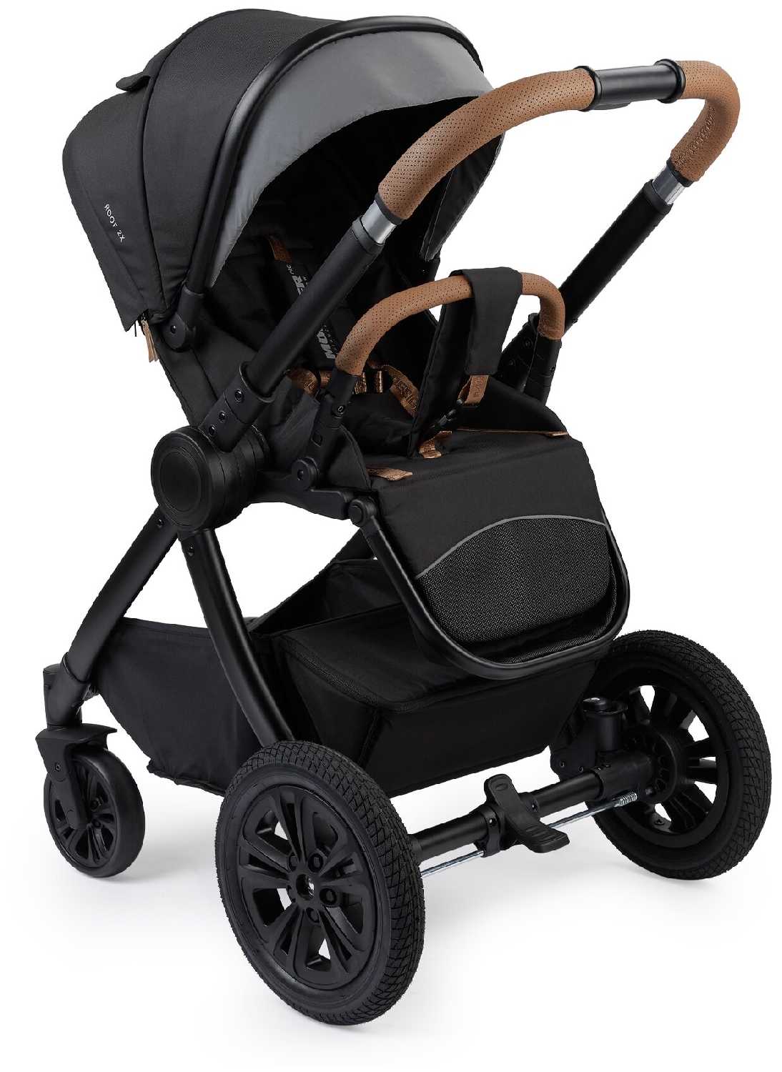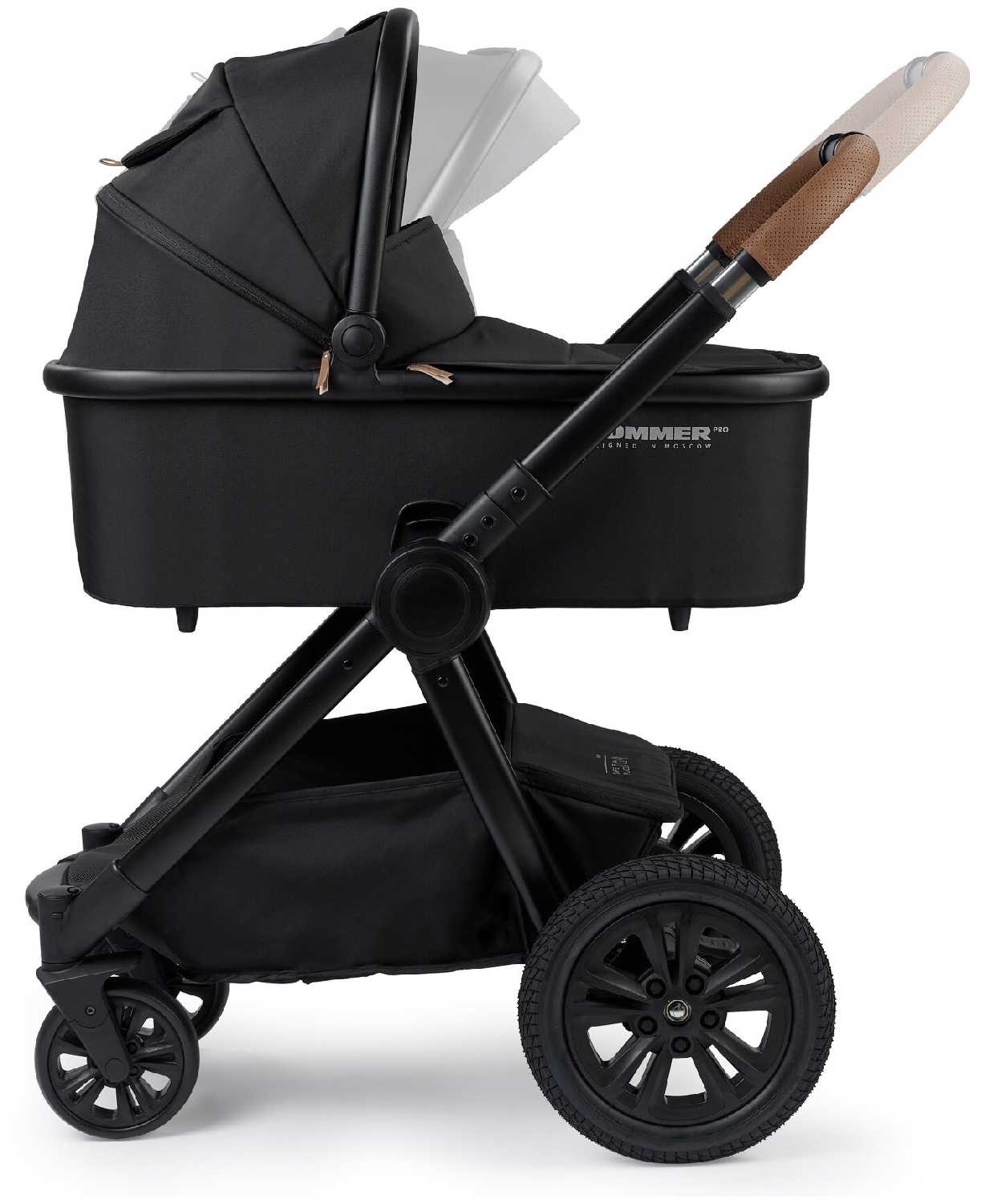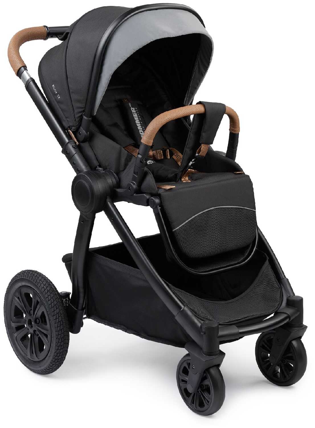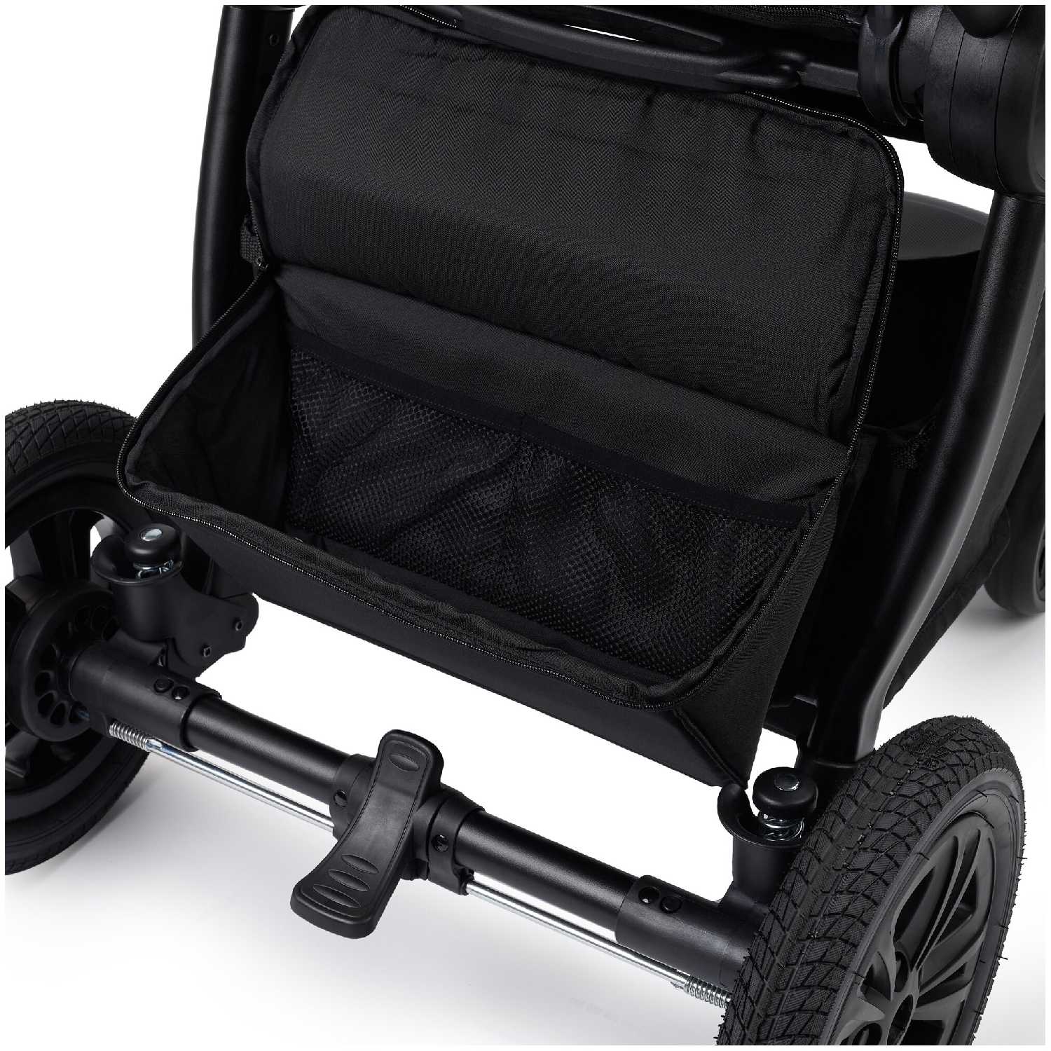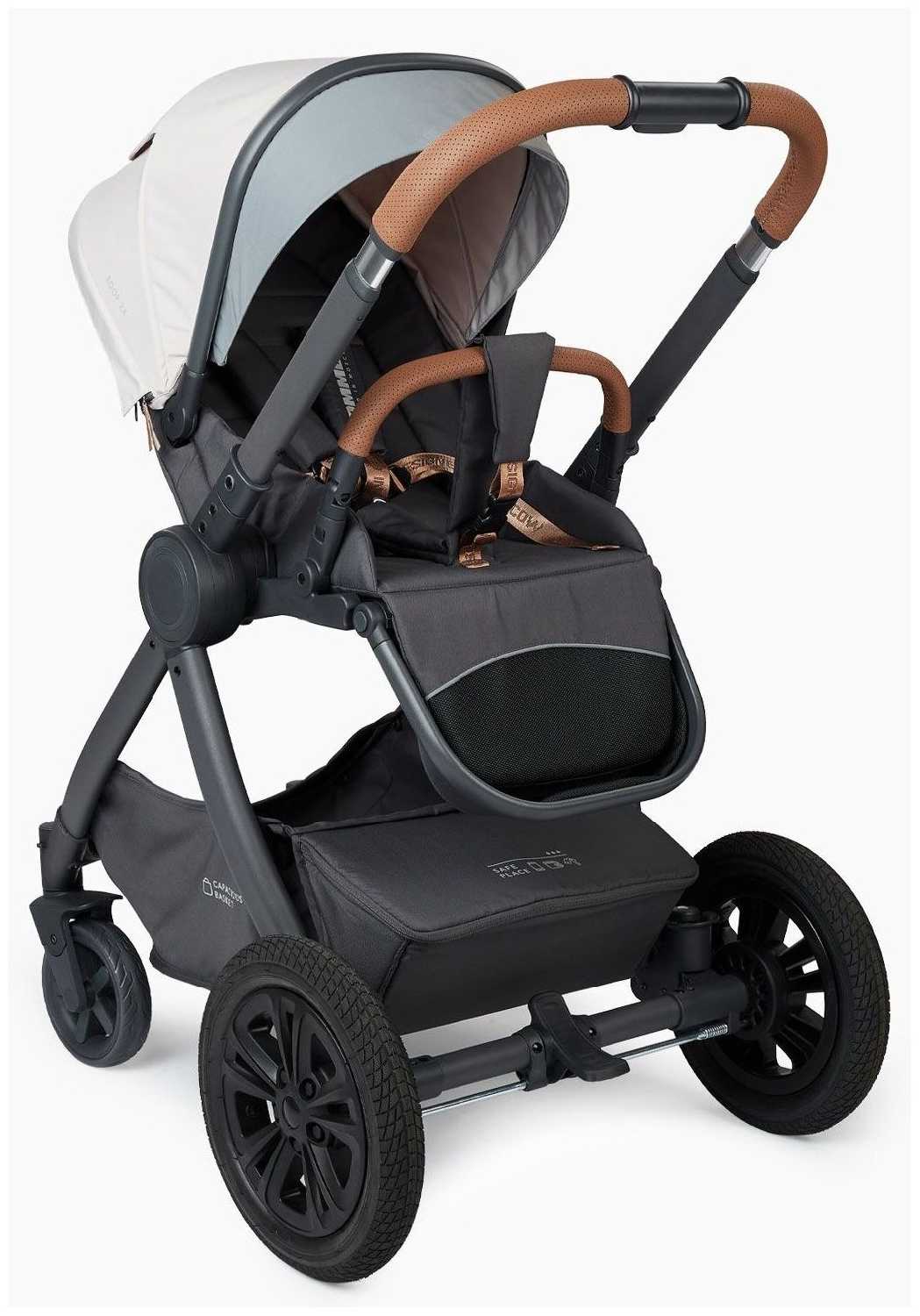 - Задние колеса большого диаметра (резиновые, с амортизацией) обеспечивают плавный ход по неровным поверхностям, включая брусчатку и снег.