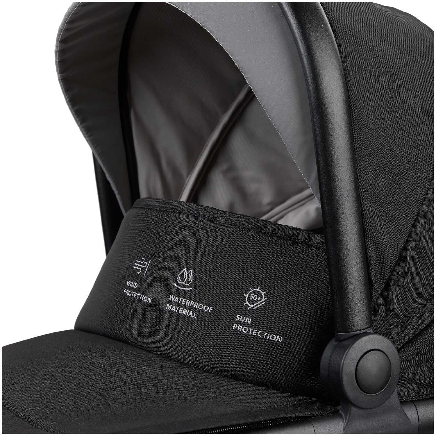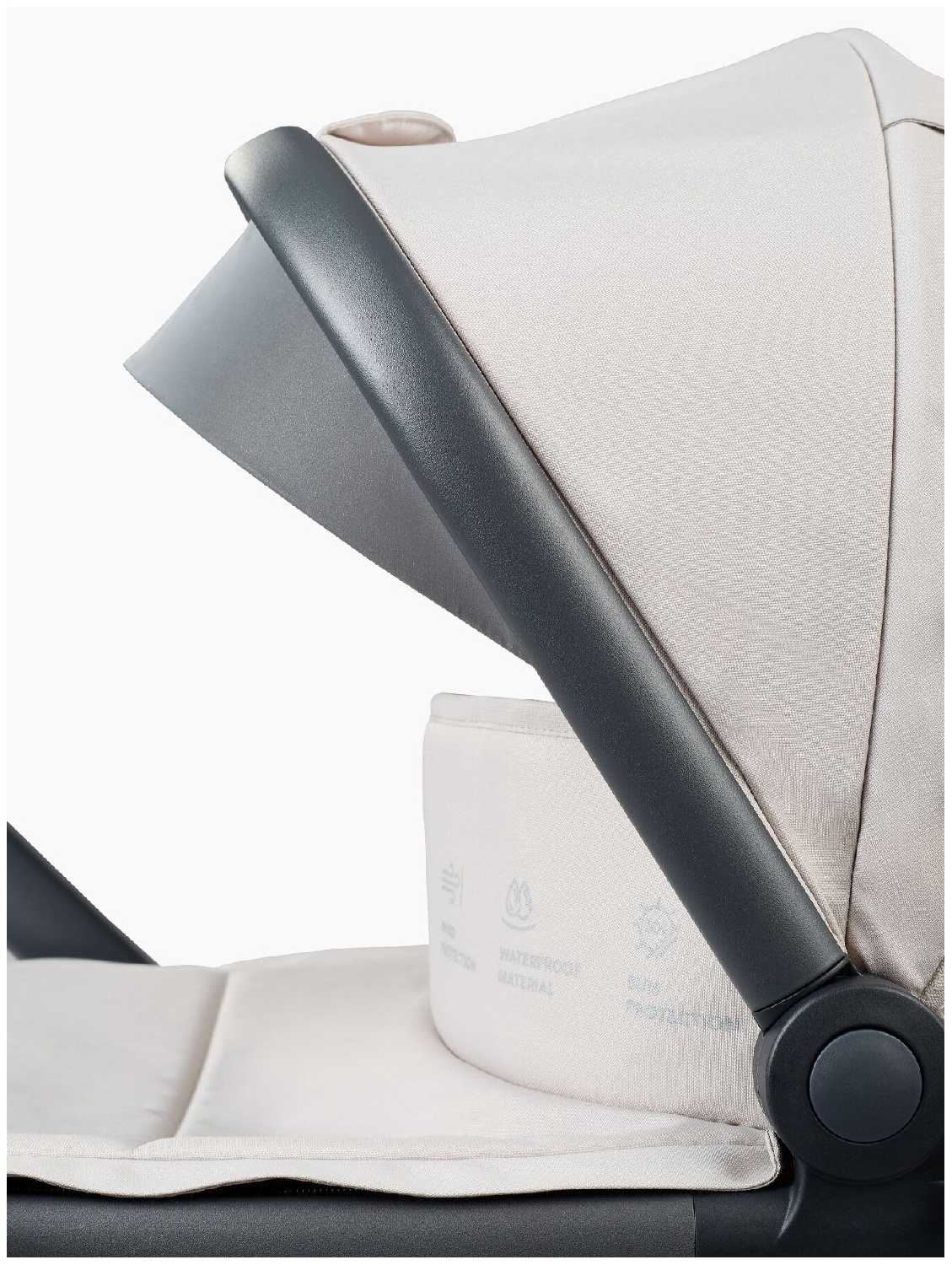- Глубокий капюшон с ветрозащитным клапаном и анатомический наклон (15°) предотвращают продувание и обеспечивают правильное положение новорожденного.