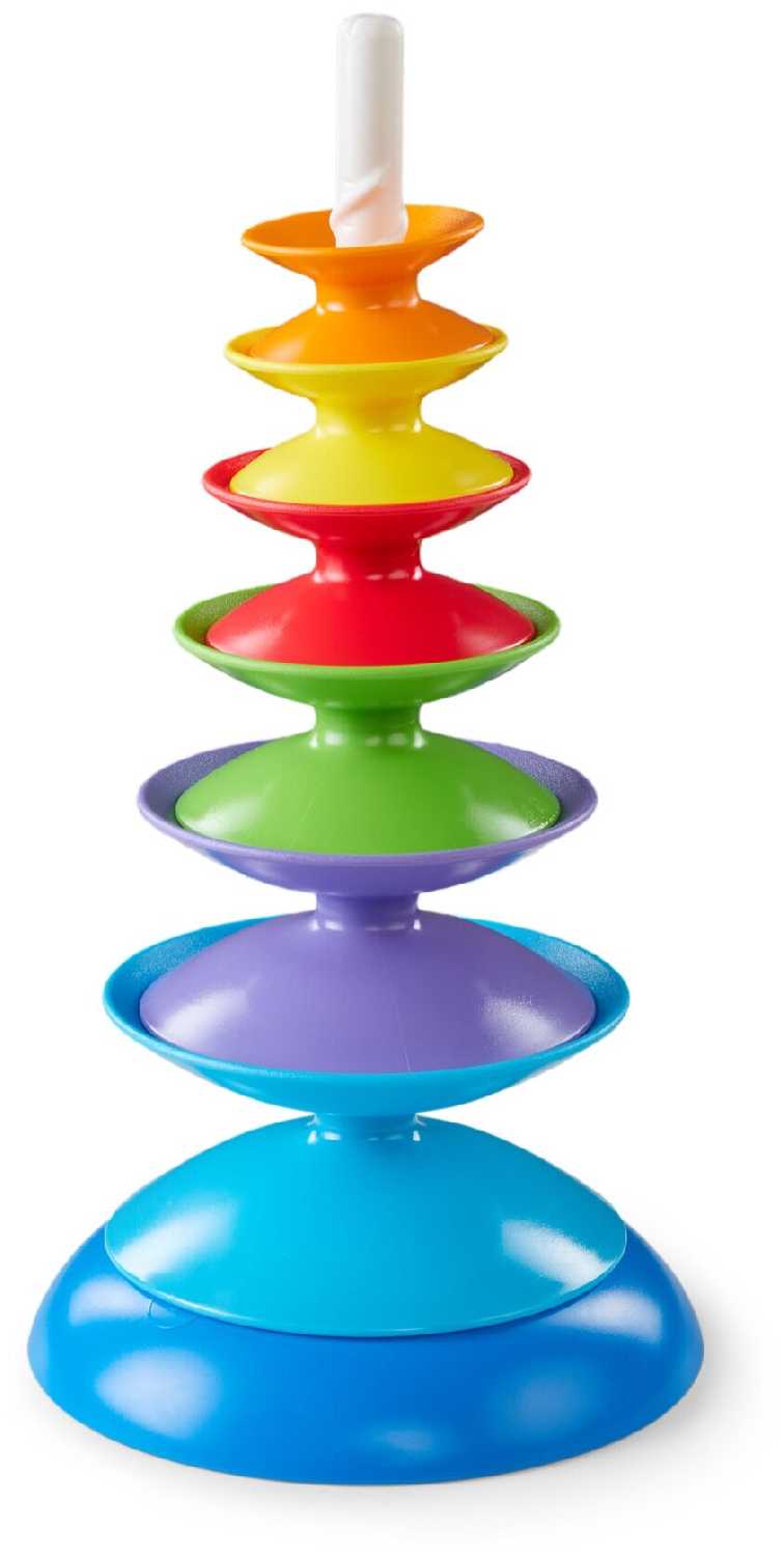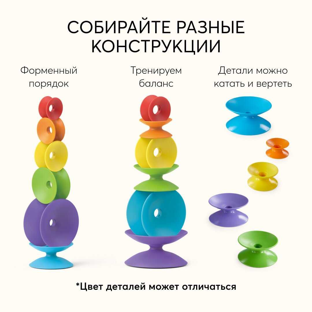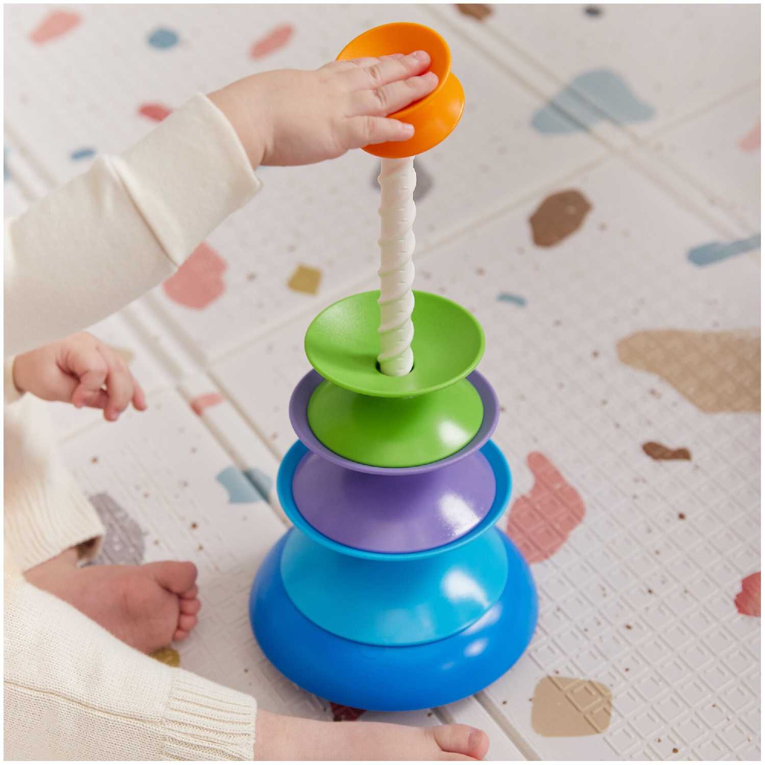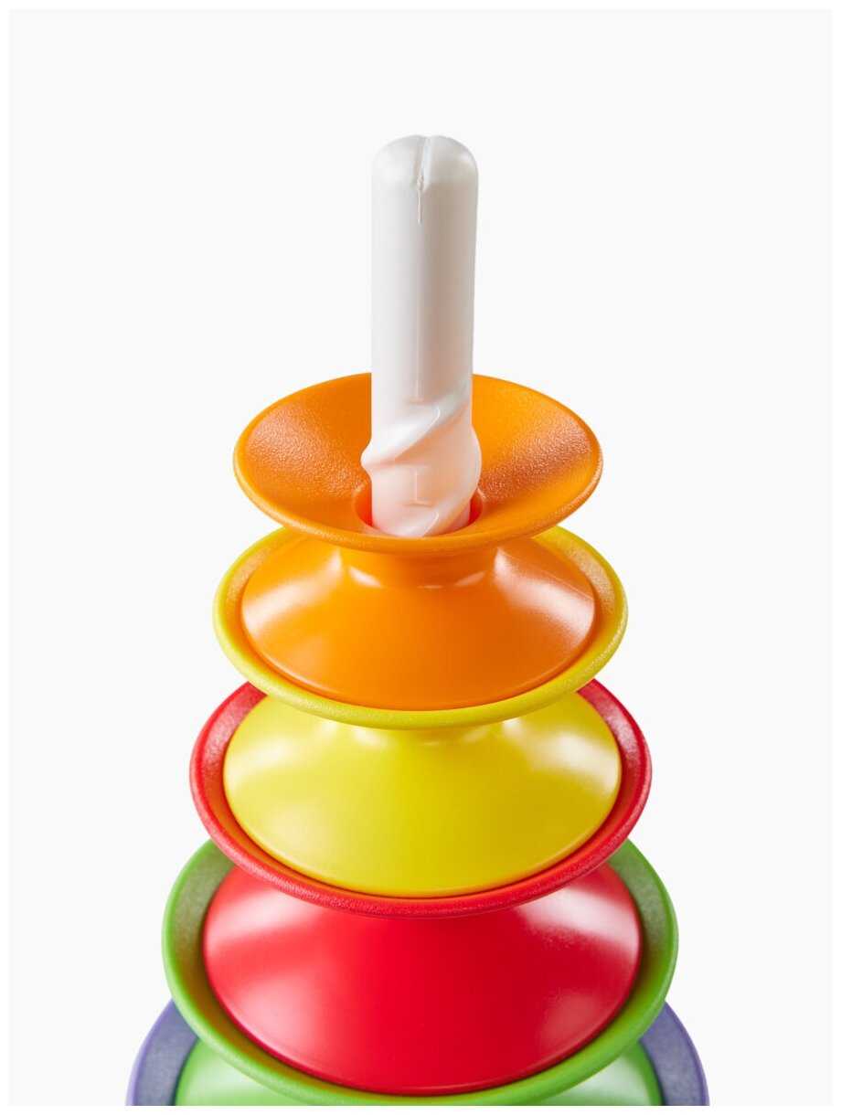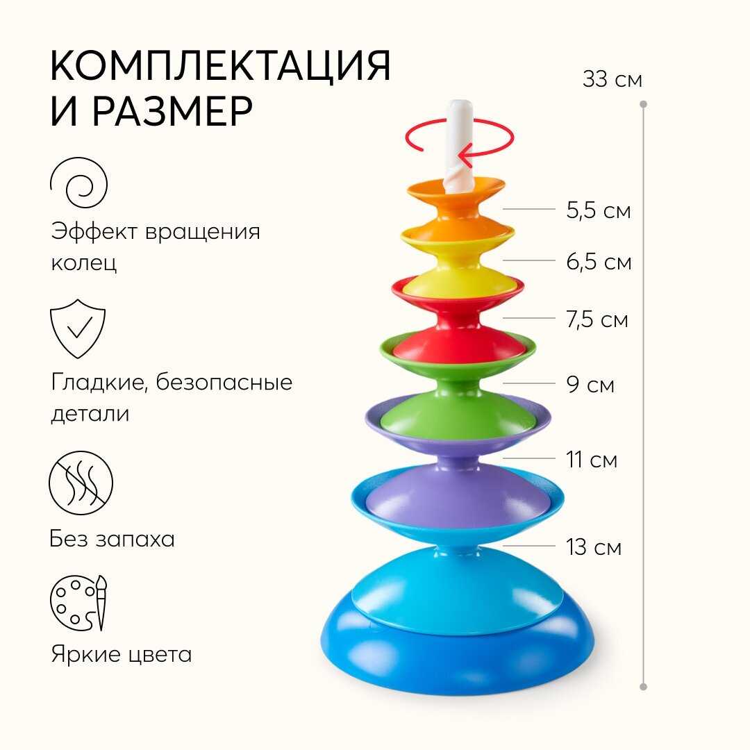 - + Очень яркая пирамида, реьенок сразу заинтересовался, можно нанизывать элементы как на основание, так и без него, придумывать с пирамидкой разные игры, малышу 10 месяцев не много сложно нанизать колечко из за узкой дырочки в элементе, но тем не менее очень довольны покупкой