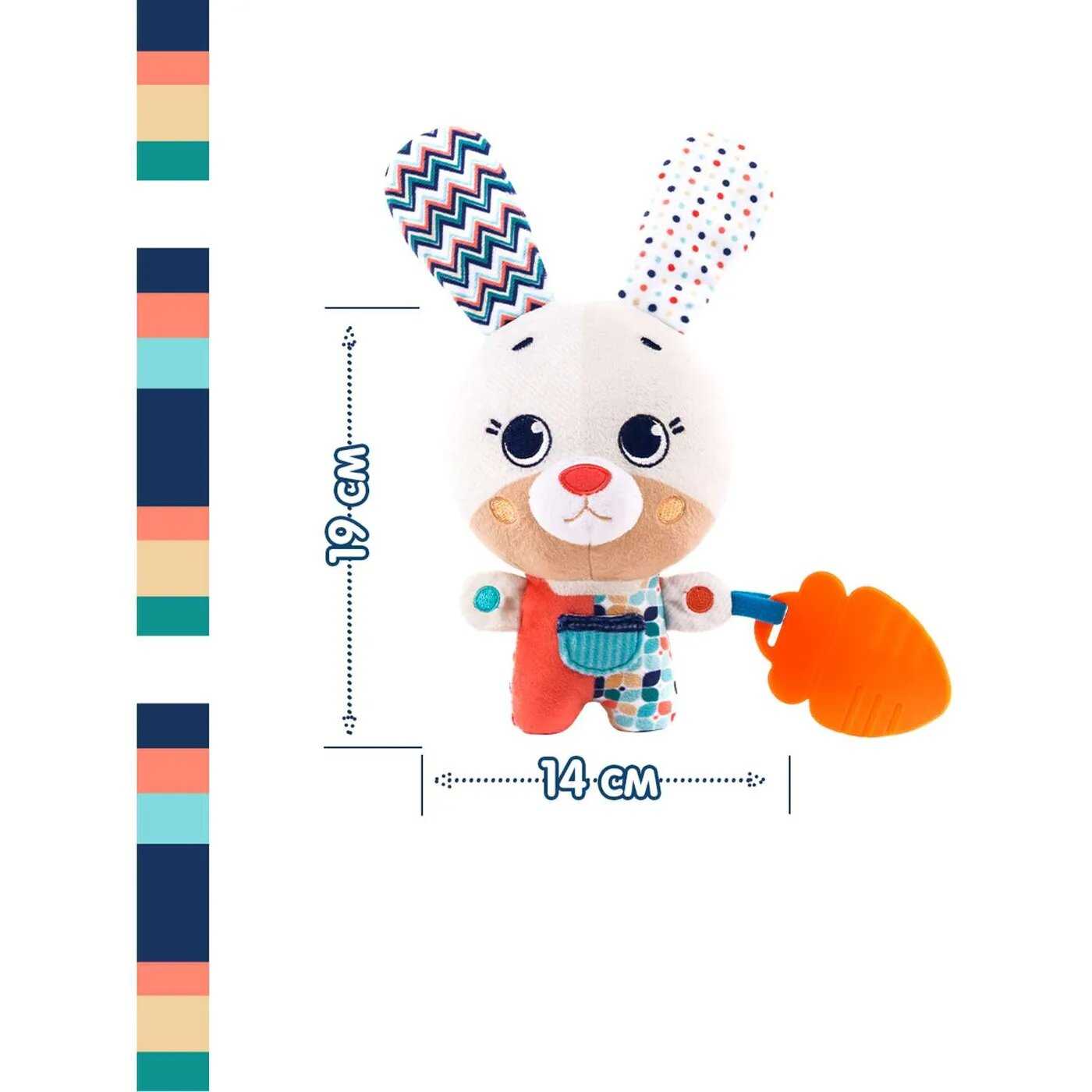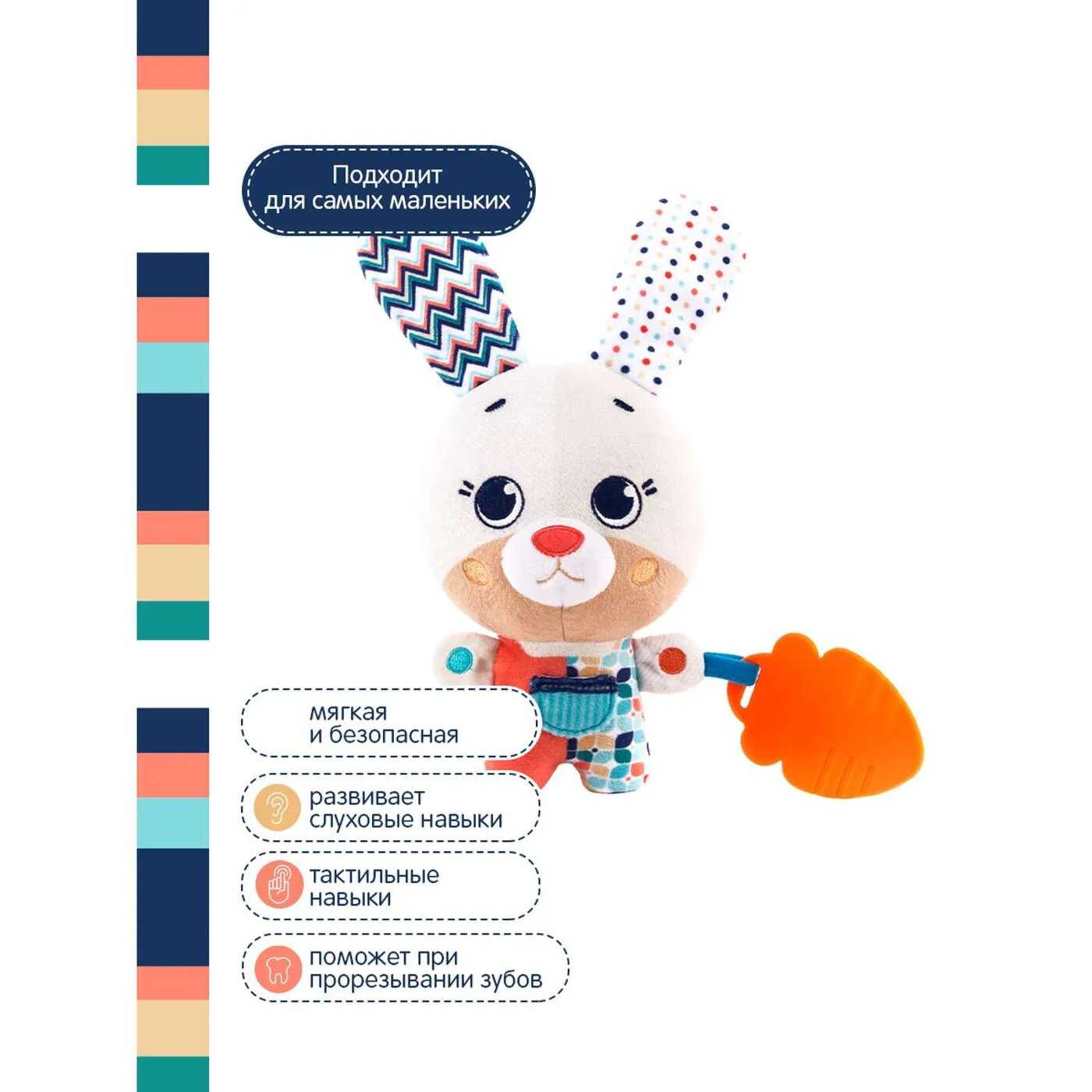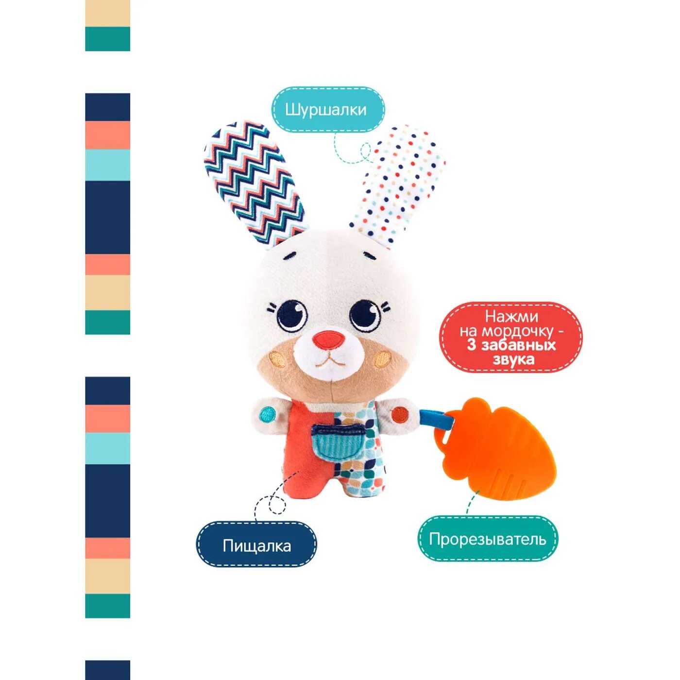 - + Отличная игрушка. Аккуратно сшита. Пищит, шелестит, есть ,что погрызть;), есть звуки. Очень удобно, что можно сменить батарею, игрушка на липучке, не защита.