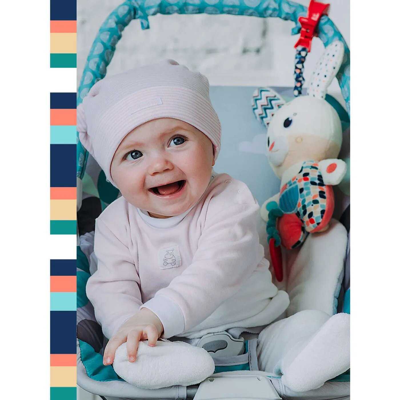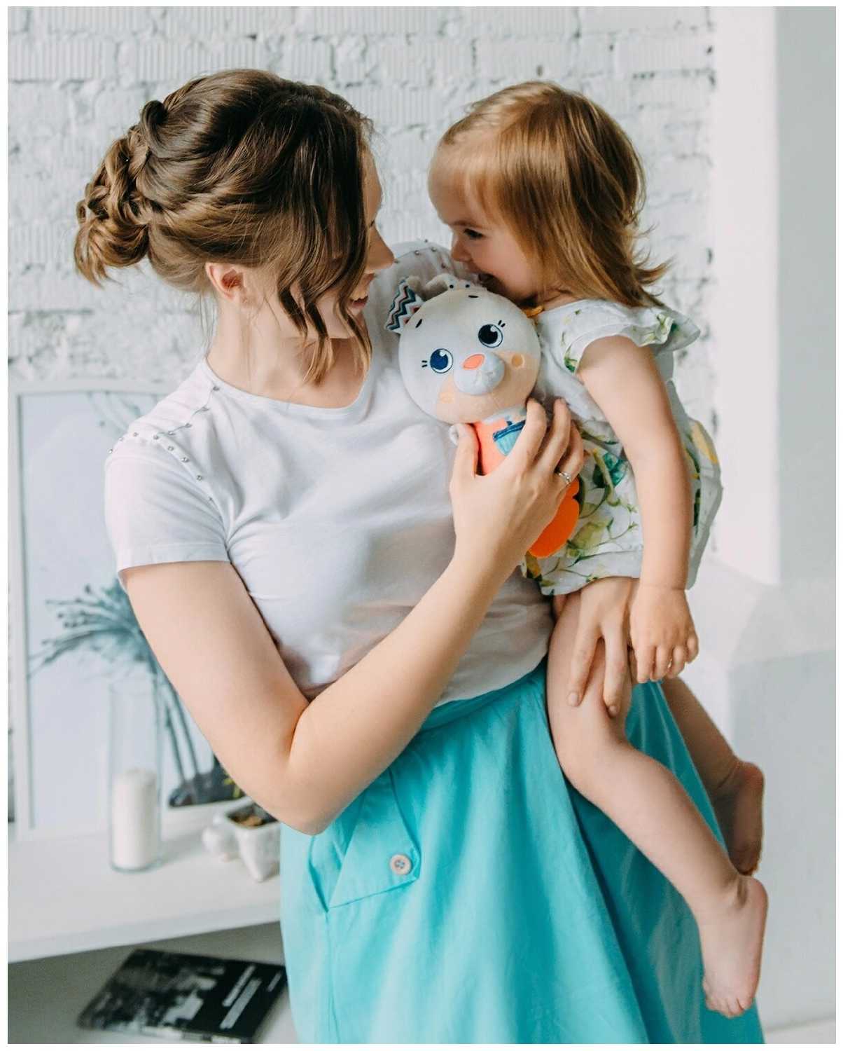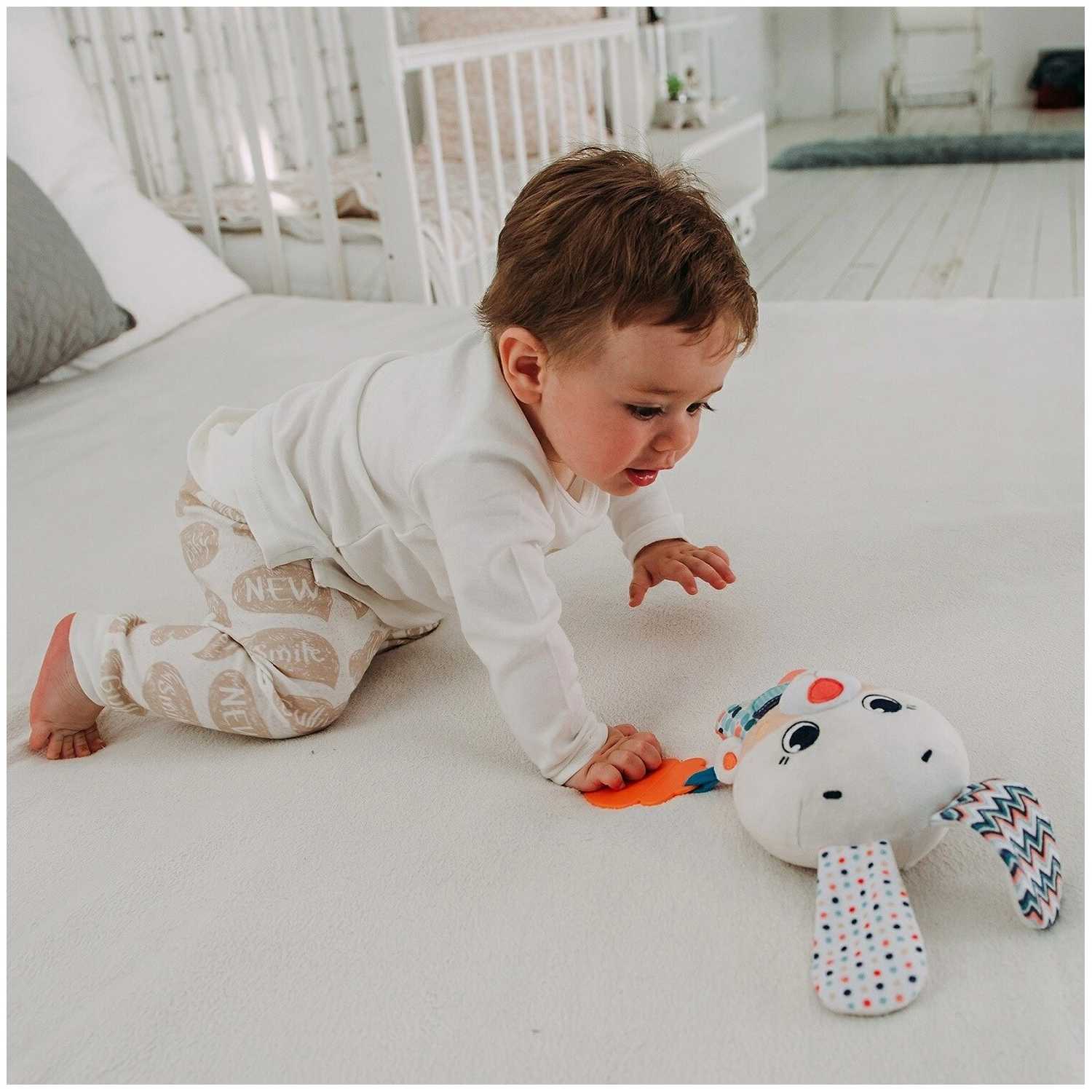 - + Отличная игрушка. Аккуратно сшита. Пищит, шелестит, есть ,что погрызть;), есть звуки. Очень удобно, что можно сменить батарею, игрушка на липучке, не защита.