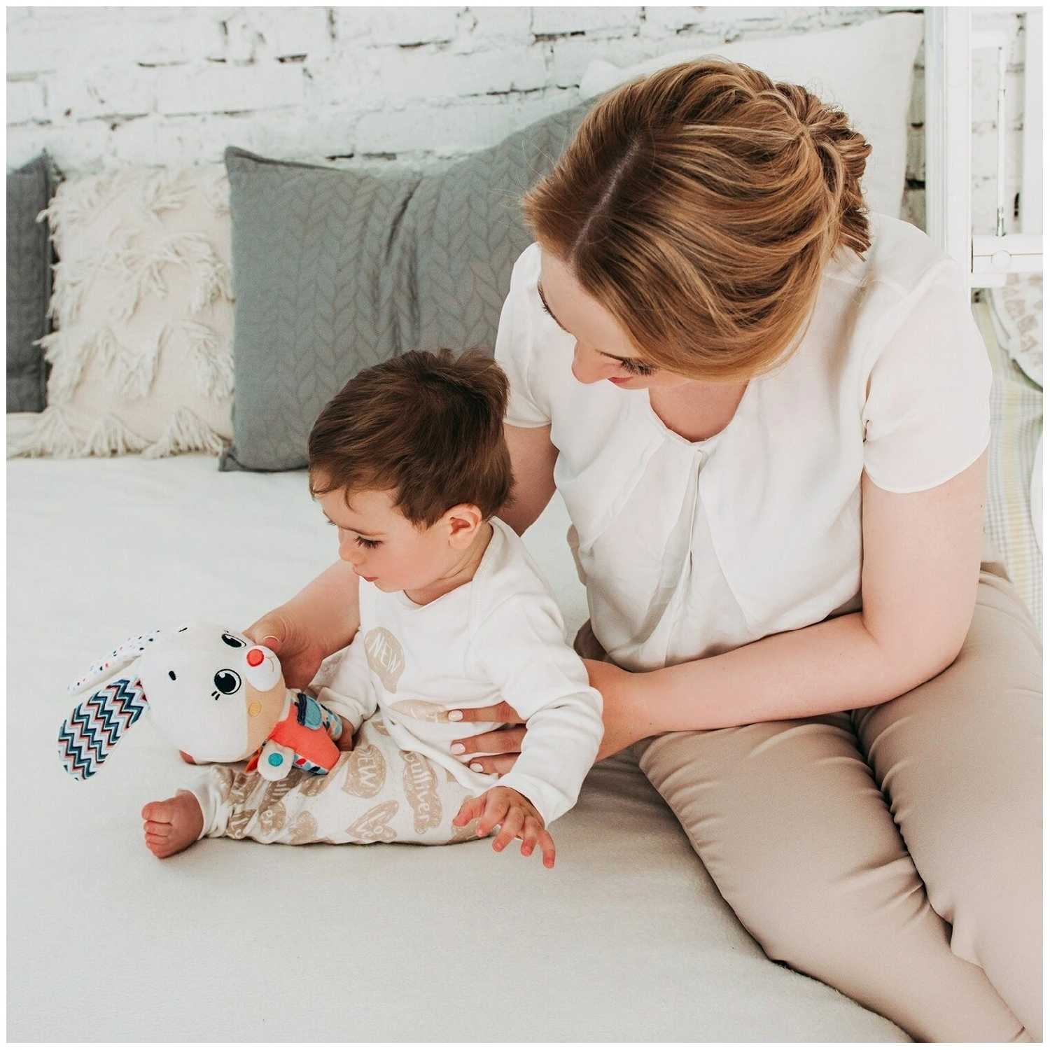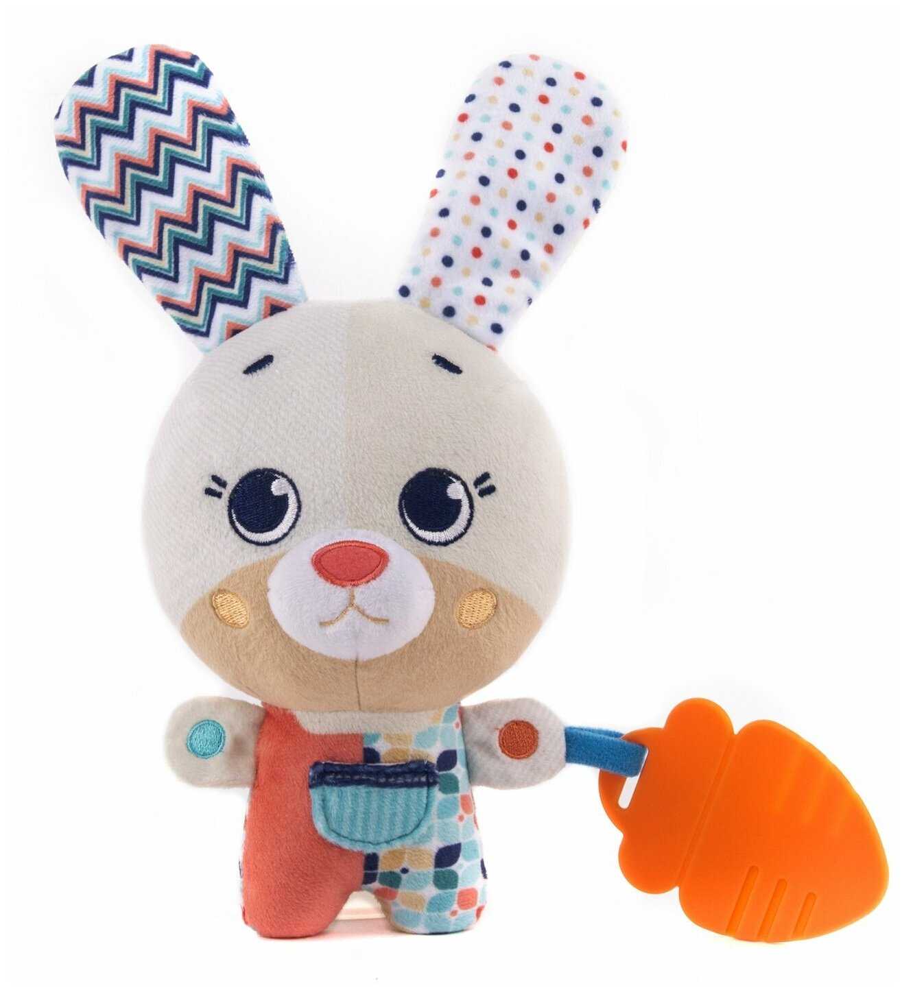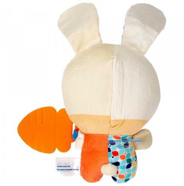 - + Классный заяц. Ребенок в восторге от ушей. Игрушка и ее звуковыдающая часть пережили ванную без последствий. Кстати, механизм можно вынуть и получится карманчик на липучке.