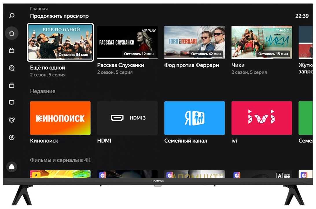 Телевизор работает на оболочке с Яндекс-сервисами и голосовым помощником Алисой, что упрощает навигацию. Из приложений предустановлены YouTube, Кинопоиск, IVI и Megogo — пользователи довольны выбором. Однако встроенный браузер и Rutube иногда вылетают, особенно при длительном просмотре, требуя перезагрузки страницы. Обновление ПО при первом включении занимает до двух часов, но дальнейшие процессы происходят быстрее. Smart TV не «летает», но работает стабильно — задержки в 5 секунд при запуске приложений отмечают лишь некоторые. Голосовое управление реагирует чётко, хотя для интеграции с умной колонкой требуется отдельное устройство.