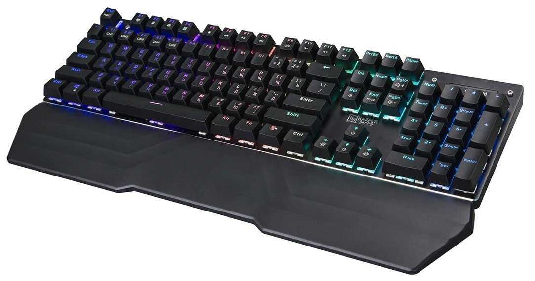 - + Полноразмерная раскладка с цифровым блоком, эргономичная подставка для запястий, программируемые макро-клавиши, высокая скорость отклика, антифантомная технология, совместимость с Windows/Mac