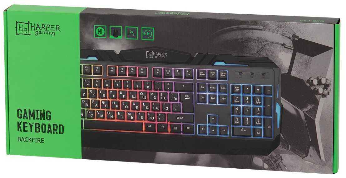 - - Буквы символы и цифры не светятся. Они просто нарисованы что видно из фото. Ночью и вечером использовать ее нельзя. Цена на проводную игровую клавиатуру Harper Backfire GKB-15 Black завышена нашим ожиданиям.