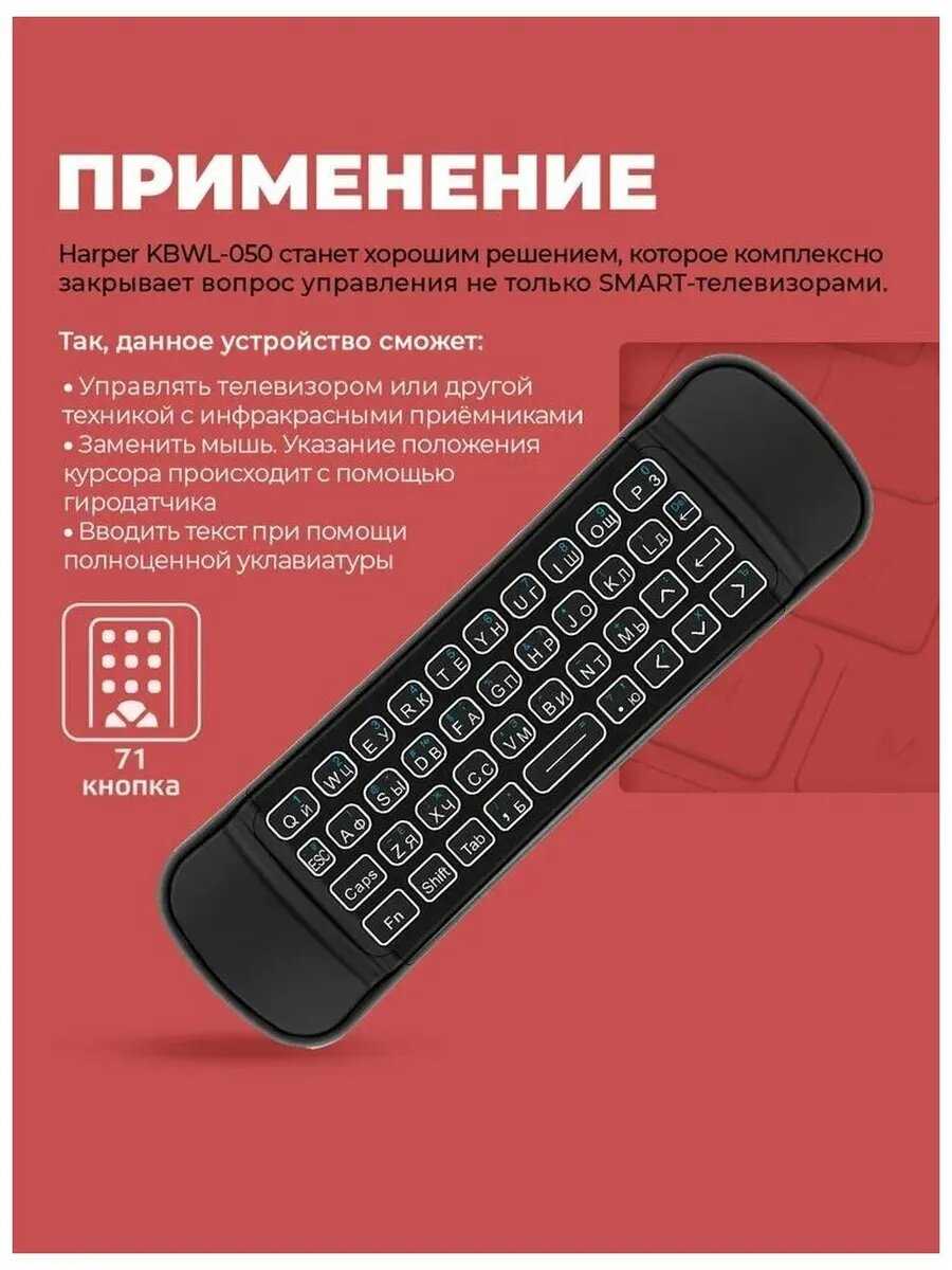 - - Думал получу три в одном, получил только аэромышь, на русскую раскладку не удалось переключить никакими танцами с бубнами, кто бы что ни писал! Кнопок ctrl, alt нет, подсветка не подсвечивает третье значение клавиш через Fn печатаемых, так что толку от неё на 50 процентов, голосовой набор НЕ РАБОТАЕТ вообще нигде!!! Даже на компе ни с алисами ни с гугл ассистентами, аэромышь тоже специфическая, пока я плясал тут с бубнами и читал форумы (инструкция ни о чем) вышло время обмена оно оказывается 7 дней, а не 14. Пульт полное разочарование, красивая игрушка, приятная на ощупь, коннектится хорошо, звук регулирует, каналы переключает. . . Знал бы нипочём не купил бы! На сайте Харпера выдаёт, что данная модель у них не обслуживается!