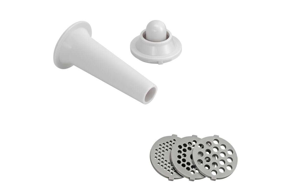 - + Мощный мотор 2000 Вт, реверс для прочистки, три диска для разной степени помола, насадка для колбас, прорезиненные ножки, металлический лоток