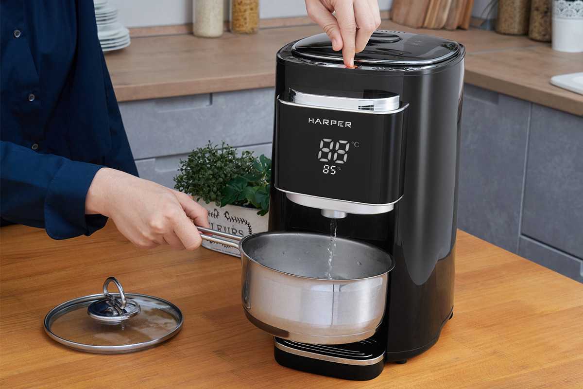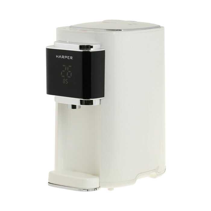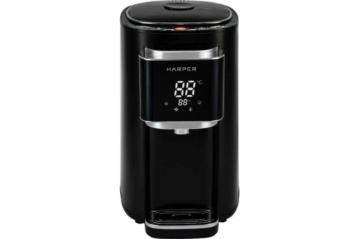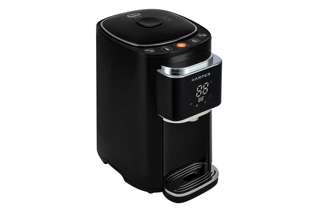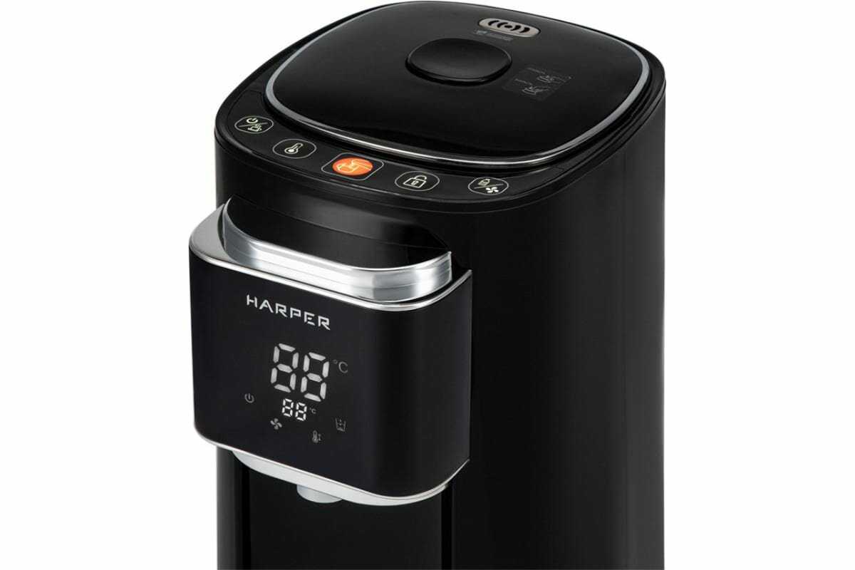 Стильный черный цвет и простой дисплей, на котором можно выбирать нужную температуру нагрева. Кроме того, термопот Harper HTP-5T01 обладает функцией термоса, автоматически охлаждает воду, снижая градусы. Крышка его снимается, как и подставка для чашки. Внутренняя колба сделана из качественного материала (нержавеющей стали), поэтому не образует накипи и известкового налета. Если в термопоте нет воды, то он не включится, а это обеспечивает безопасность эксплуатации. Очень полезная вещь для большой семьи.