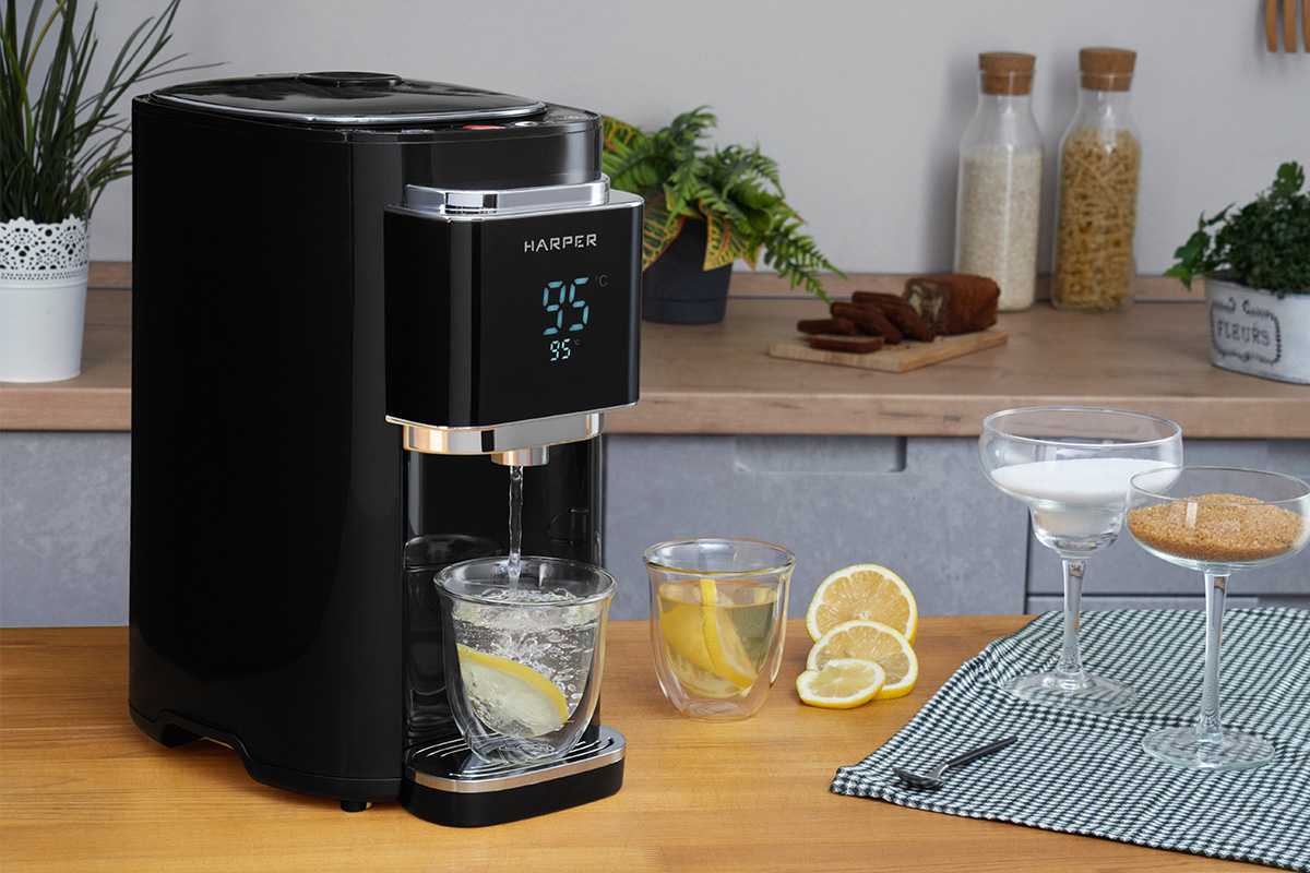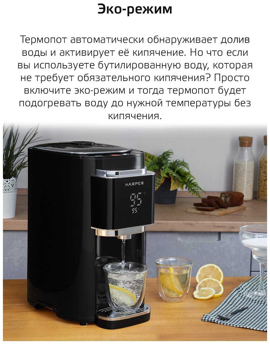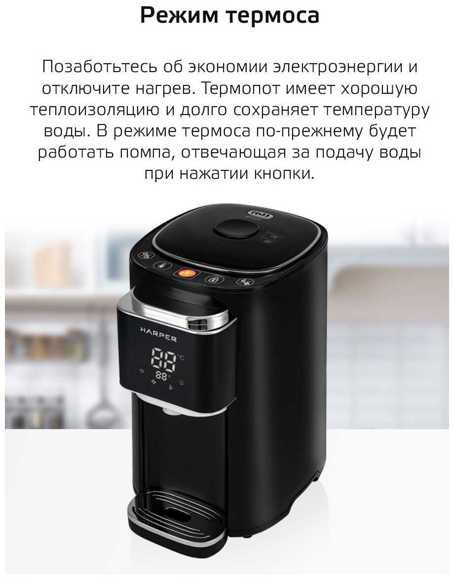 Приличный объем колбы из нержавеющей стали (5 л), которой не страшна коррозия и накипь. Колбу, как и пластиковый корпус легко мыть. Термопот Harper HTP-5T01 занимает на кухне мало места, как электрочайник. Нагревательный элемент расположен внутри. За 8-9 минут нагревает холодную воду из-под крана до 100 градусов. В любое время я могу использовать горячую воду (от 45 до 95 градусов), отрегулировав температурный режим на сенсорной панели. Вода наливается в чашку с помощью автоматической помпы, при наливе вода не разбрызгивается.