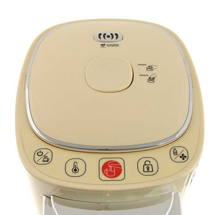 - + Красивый термопот, у меня в бежевом цвете. Купили на дачу. Объем 5 л очень удачный для 6 человек. Режимы t очень удобные. Внизу подставка под чашку с поддончиком для сбора капель, легко снимается, разбирается и моется. Большой плюс, что крышка термопота снимается , а не просто открывается, - удобно выливать остатки воды, мыть и наполнять свежей водой. Кнопки управления понятные и удобные.