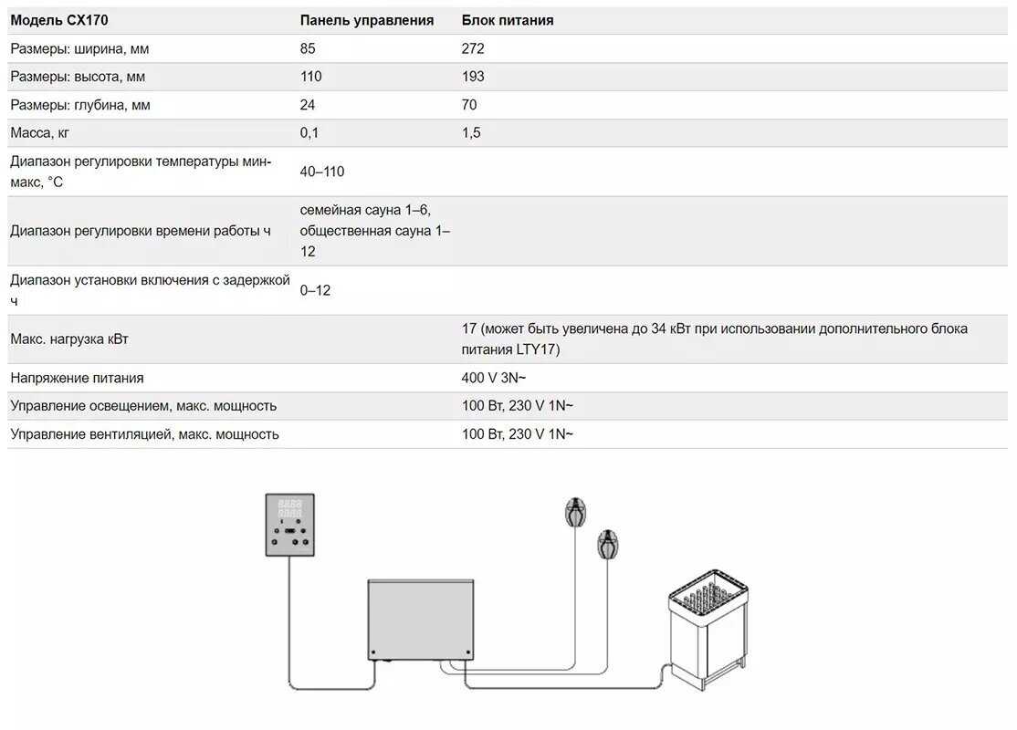 Дополнительная информация : | диапазон регулировки температуры 40-110 ° C, освещение и управление вентилятором, семейная сауна 1-6 ч коммерческая сауна 1-12 ч, диапазон настройки заданного времени 0-12 ч, напряжение питания блока питания 400 В 3N |