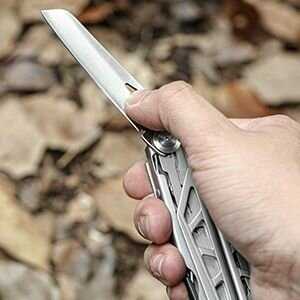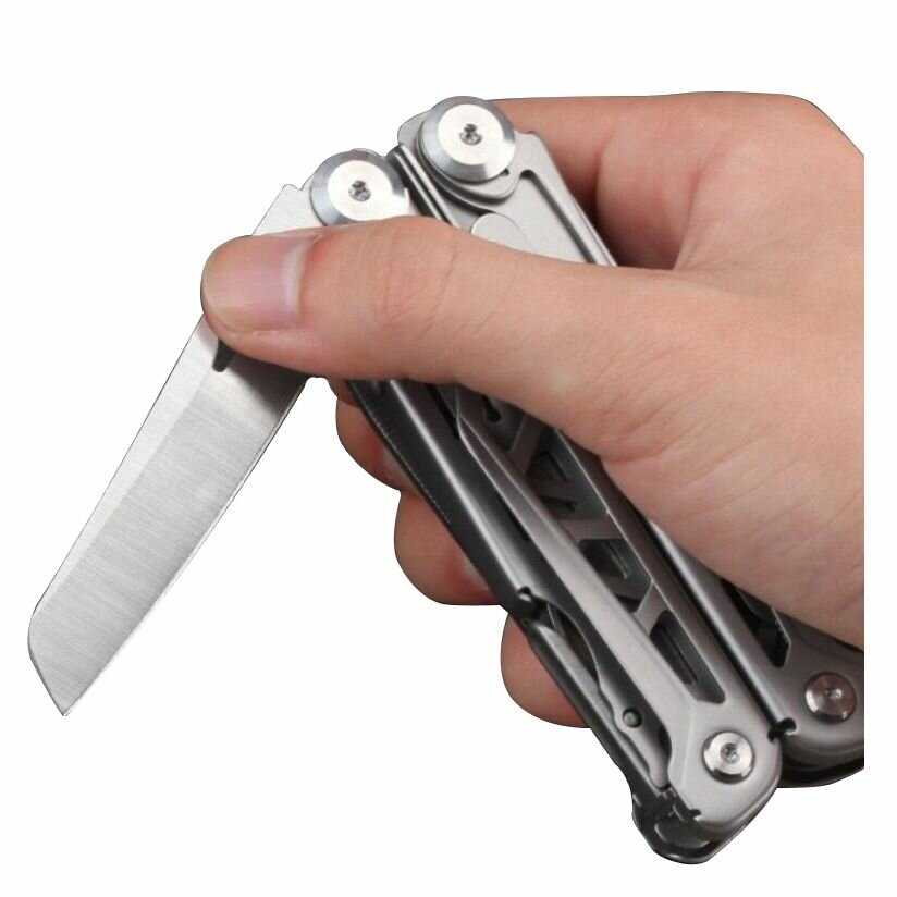- + Крепкий, не люфтит. Есть защёлки для используемых элементов. Нож, пила и ножницы очень острые. Присутствует резак на пасатижах со сменными лезвиями и отдельным шестигранником для их замены