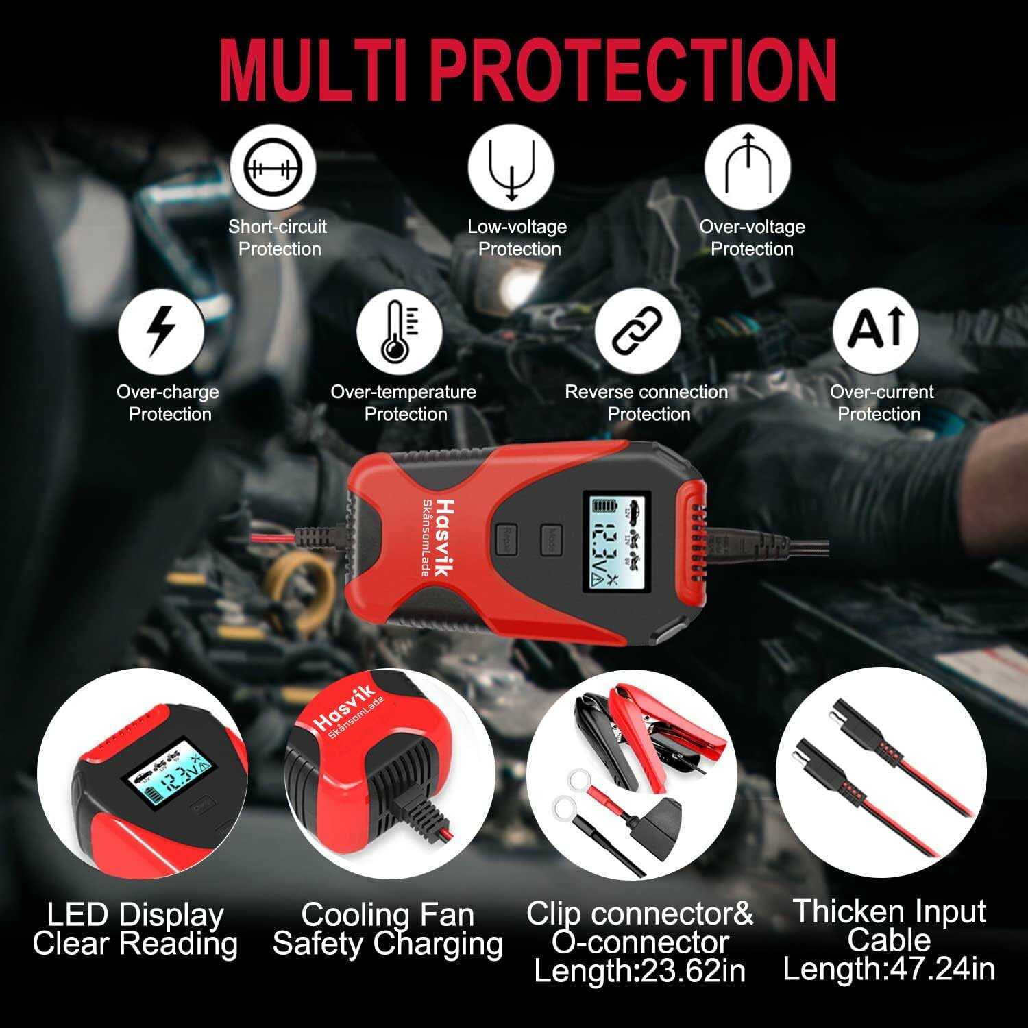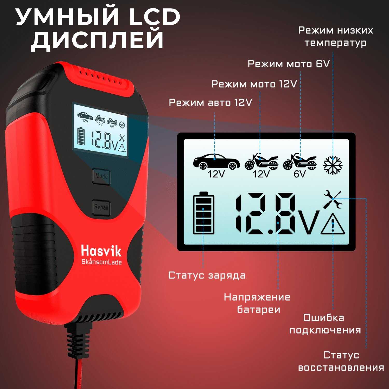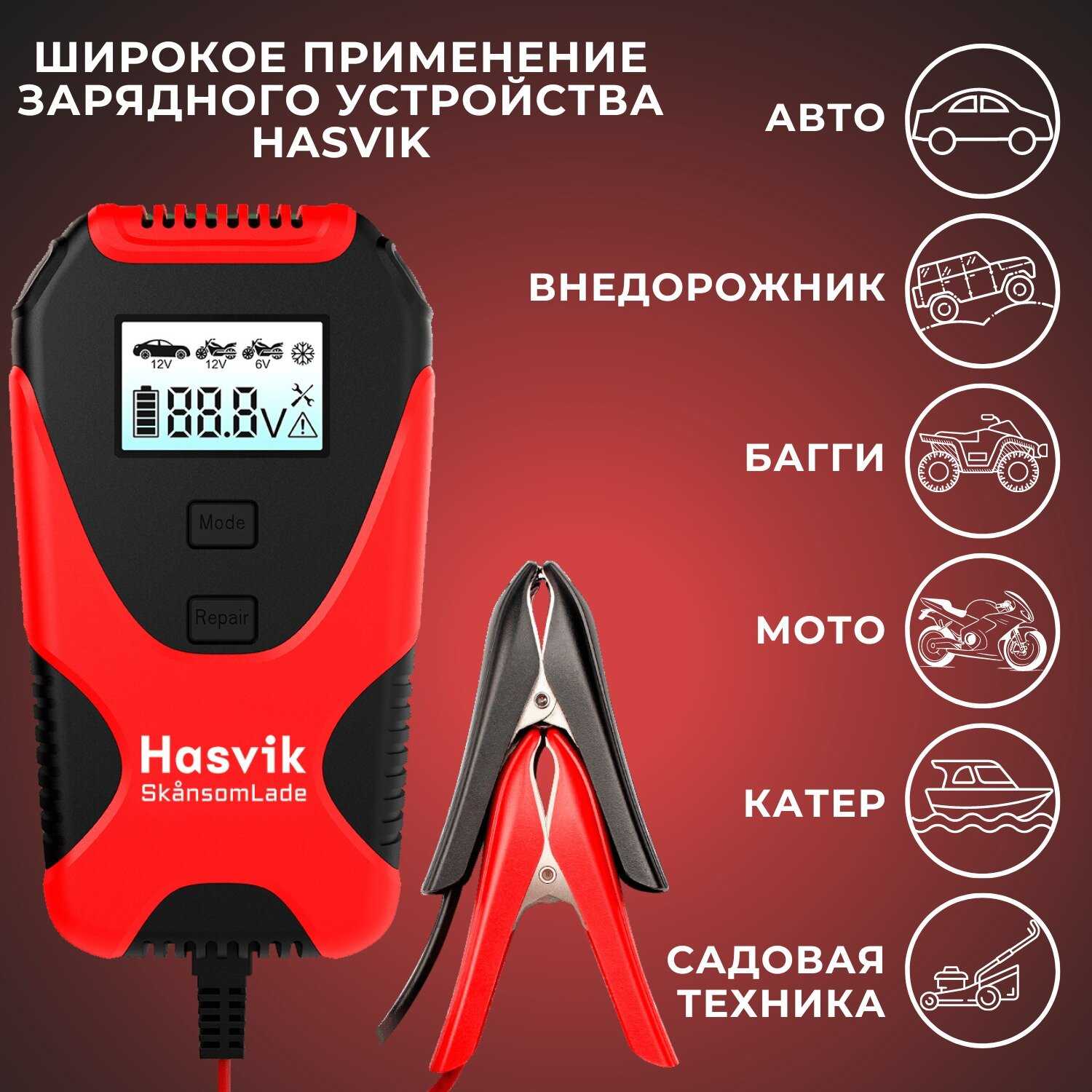 Подробная комплектация : | Зарядное устройство Hasvik SkansomLade, зарядные провода 12V, провод питания 220V, инструкция и гарантийный талон: износостойкий кейс |