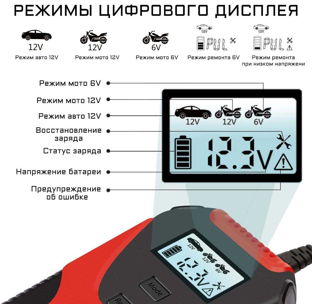 Функции : | автоматическое отключение зарядки, подходит для AGM/GEL аккумуляторов, режим зимней зарядки, тест состояния АКБ |
