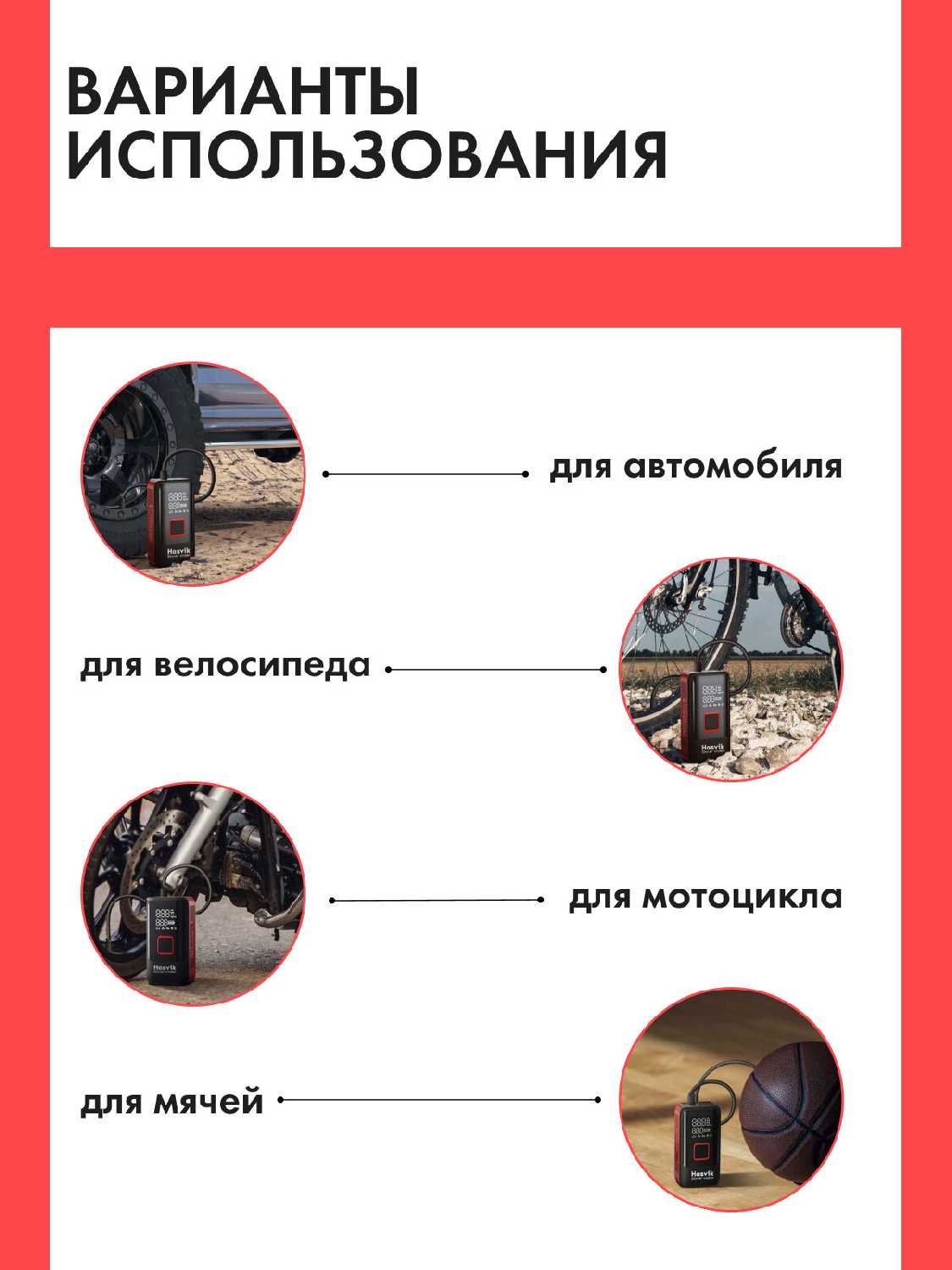 Подробная комплектация : | Компрессор - 1 шт, кабель для быстрой зарядки Type-C - 1 шт, игла для мяча - 1 шт, насадка для воздушных игрушек - 1 шт, клапан Presta - 1 шт, быстросъемный переходник - 1 шт, шланг высокого давления - 1 шт, защитный кейс - 1 шт, кабель питания в прикуриватель - 1 шт, инструкция и гарантийный талон - 1 шт. |