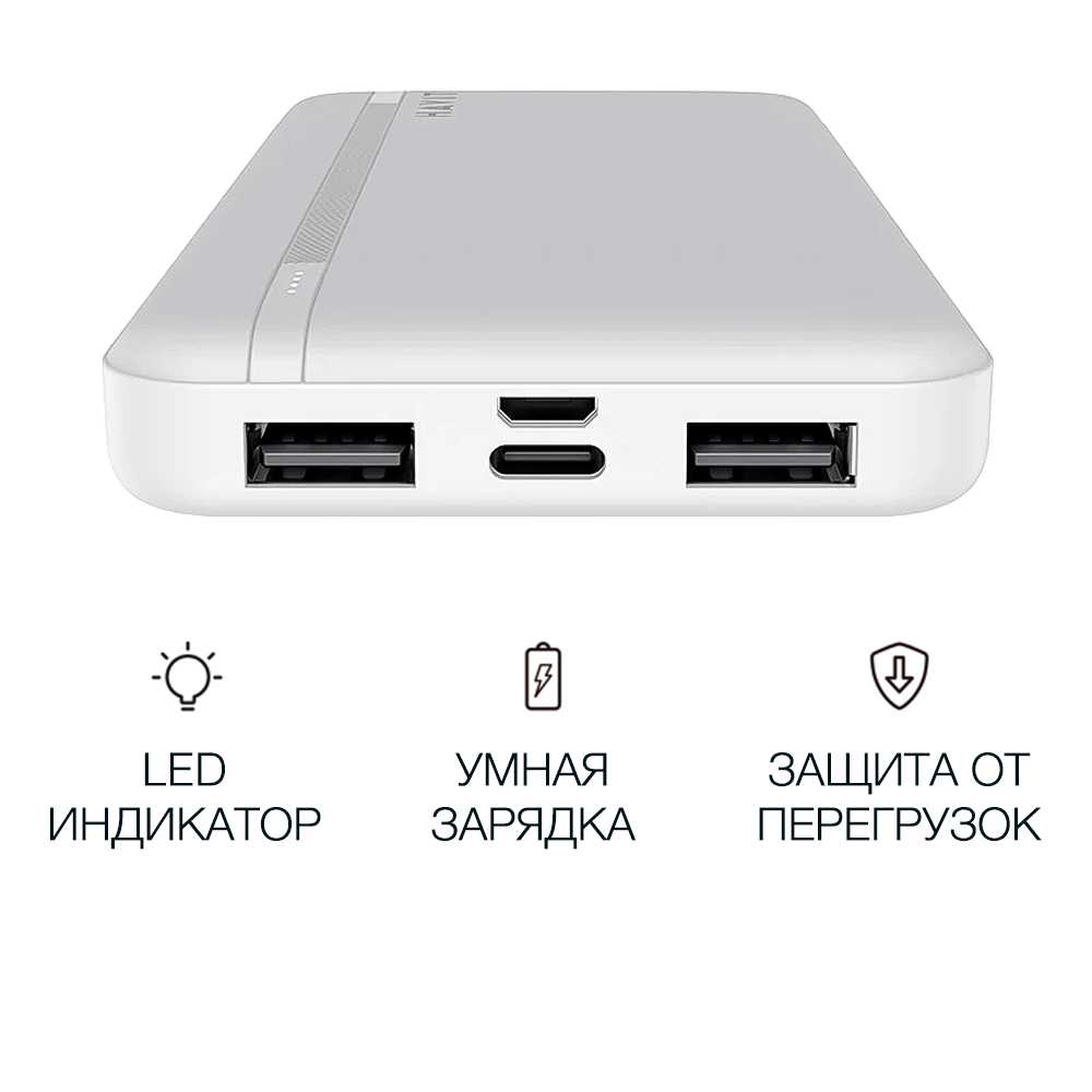 - Большая ёмкость на 10000 мАч для нескольких зарядок смартфона