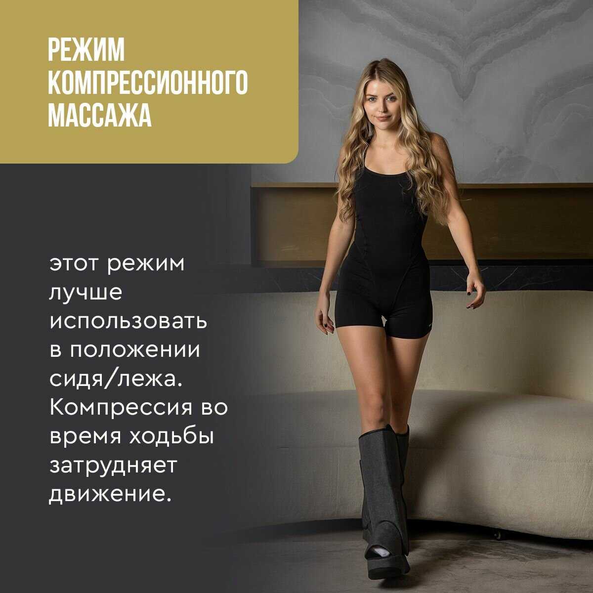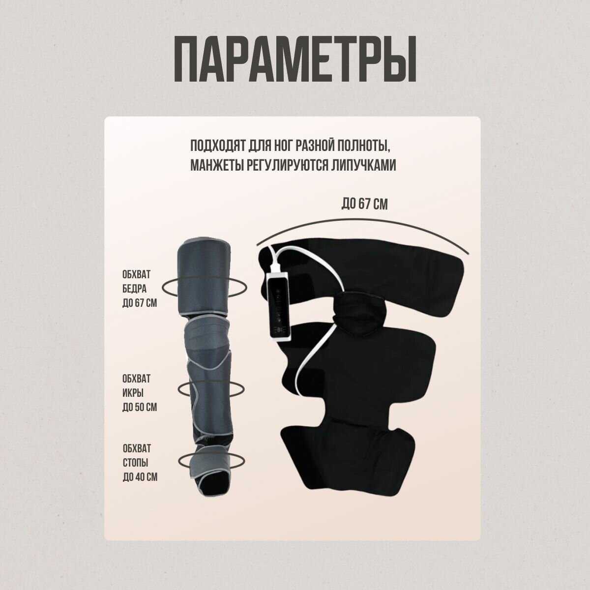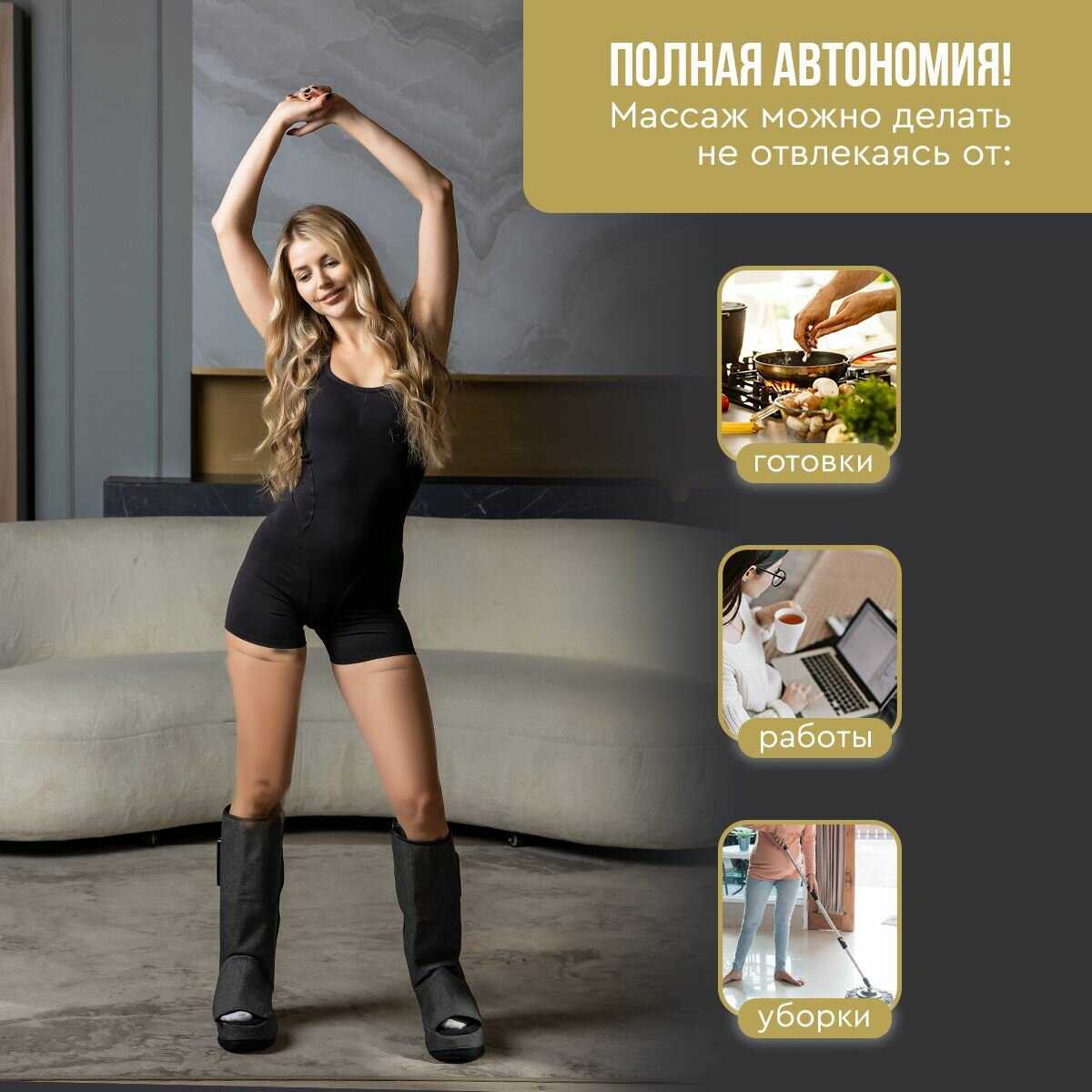 - + Полностью соответствует моим пожеланиям! 4 разных режима, лайтовый для начала и для тех, кому это вновь и по нарастающей до одновременного накачивания всех 6 камер и сбрасывания воздуха. Я переживала, что будет мне огромный, т. к. размер одежды 42, но все можно отрегулировать первой кнопкой ( интенсивность), мне на 3-4 хорошо так сдавливает. Муж 50 размер носит одежды, в сапоги влезает свободно, без растягивания. Так что, кто переживает за универсальность размера- сомнения в сторону! Штука классная и нужная, особенно тем, у кого отечность частое явление. Если соблюдать питьевой режим, следить за питанием, то и без особых активностей можно скинуть вес и рельеф поправить. Ну а с активностями так вообще быстро!
