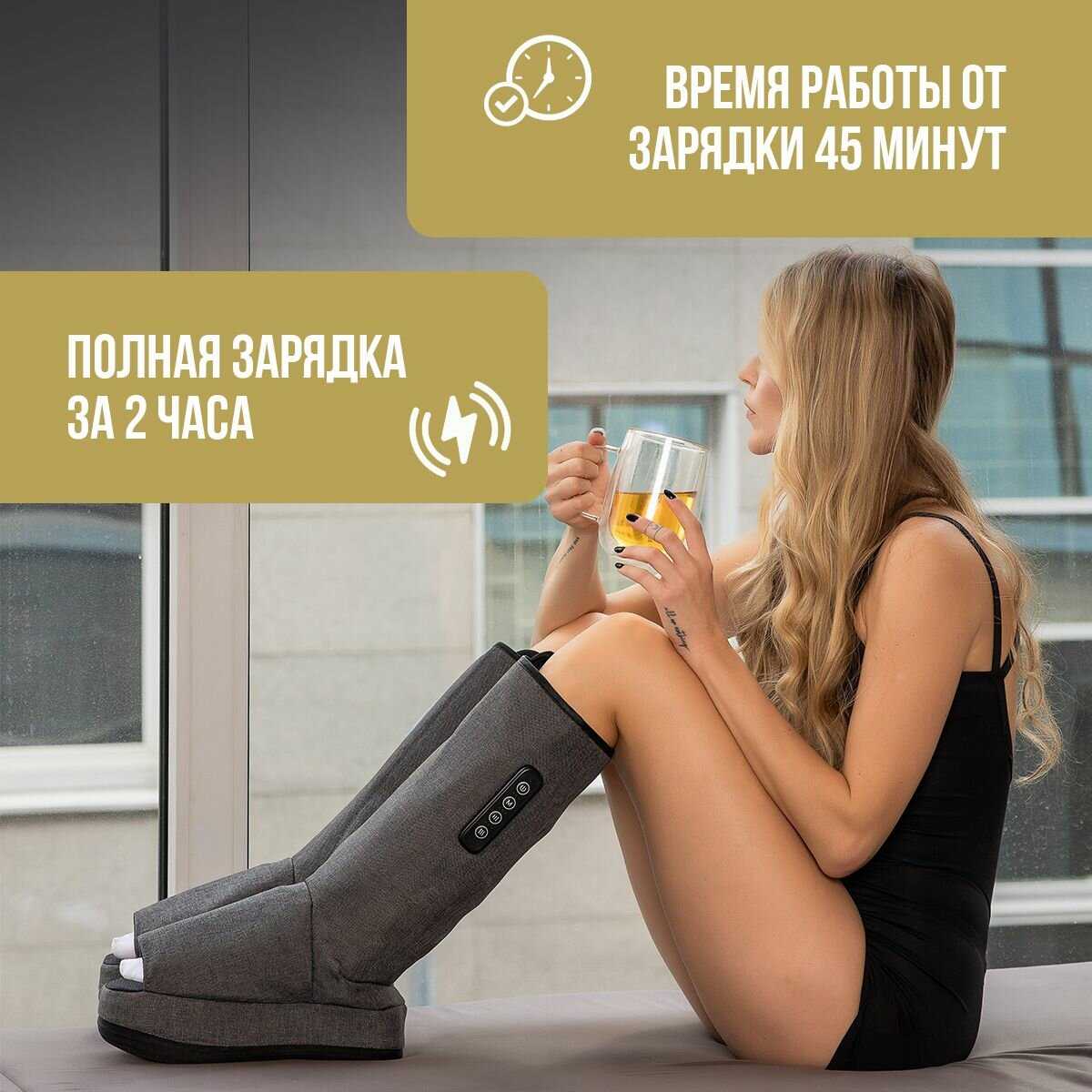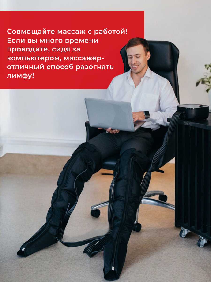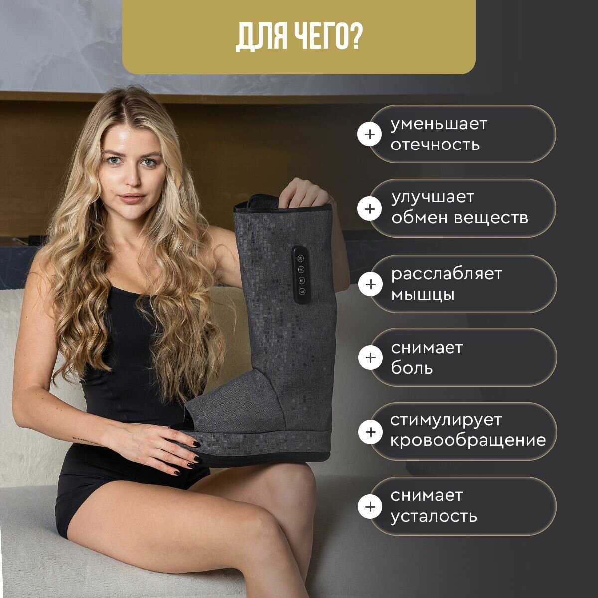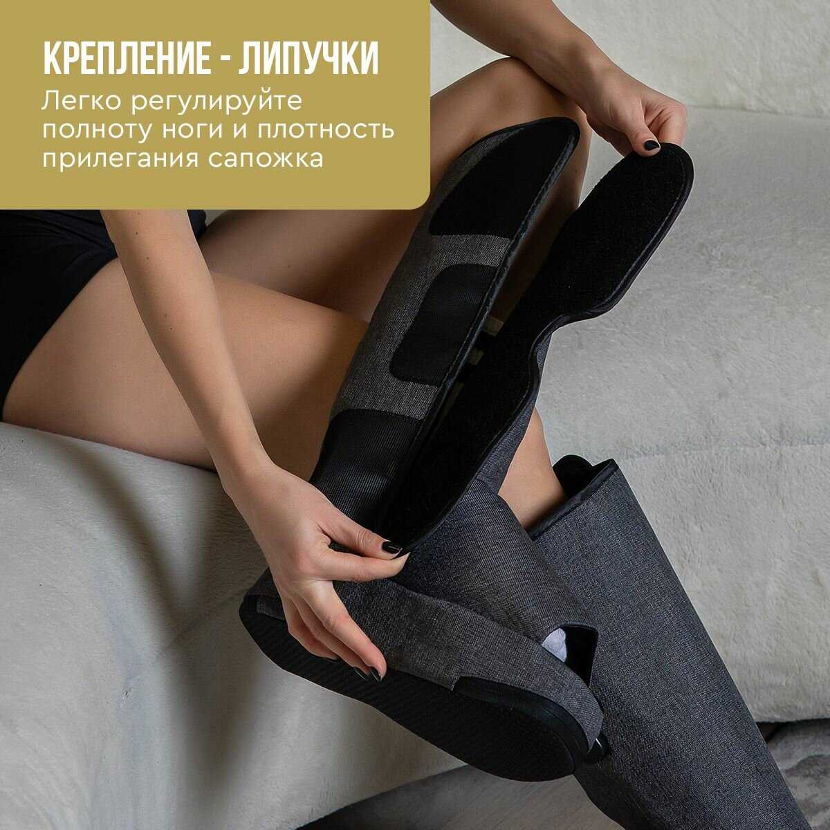- + Полностью соответствует моим пожеланиям! 4 разных режима, лайтовый для начала и для тех, кому это вновь и по нарастающей до одновременного накачивания всех 6 камер и сбрасывания воздуха. Я переживала, что будет мне огромный, т. к. размер одежды 42, но все можно отрегулировать первой кнопкой ( интенсивность), мне на 3-4 хорошо так сдавливает. Муж 50 размер носит одежды, в сапоги влезает свободно, без растягивания. Так что, кто переживает за универсальность размера- сомнения в сторону! Штука классная и нужная, особенно тем, у кого отечность частое явление. Если соблюдать питьевой режим, следить за питанием, то и без особых активностей можно скинуть вес и рельеф поправить. Ну а с активностями так вообще быстро!