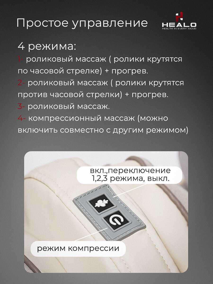 Управление имеет недостатки: переключение режимов требует последовательного пролистывания всех опций, что неудобно при необходимости быстро изменить настройки. Отсутствие чётких индикаторов работы, особенно для подогрева, затрудняет контроль — например, подсветку не видно при массаже икр. Пользователи отмечают, что регулировка мощности не интуитивна, а для выключения нагрева нужно проходить весь цикл настроек, что снижает комфорт при активном использовании.