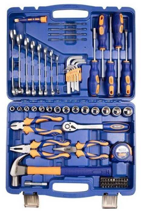 Большой набор инструментов для ремонта. В комплекте 78 предметов, есть все необходимое: комбинированные ключи 8-17мм, г-образные 1,5-10 мм, отвертки, большой выбор головок, пассатижи, длинногубцы, молоток, рулетка. Понравилось качество металла и пластика, увесистые, не гнуться от большой нагрузки. Качественно выполнен кейс, держит хорошо, ничего не вываливается и не болтается. Биты хорошо магнитятся и не вылетают из отверток. Набор достойный, инструменты приятно держать в руках, стоит своих денег.