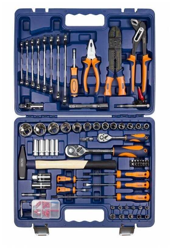 | Инструменты в комплекте : | бокорезы, клещи, ключ разводной, ключи гаечные, ключи имбусовые (шестигранные), ключи торцевые, молоток, отвёртки, пассатижи, плоскогубцы, трещотка |