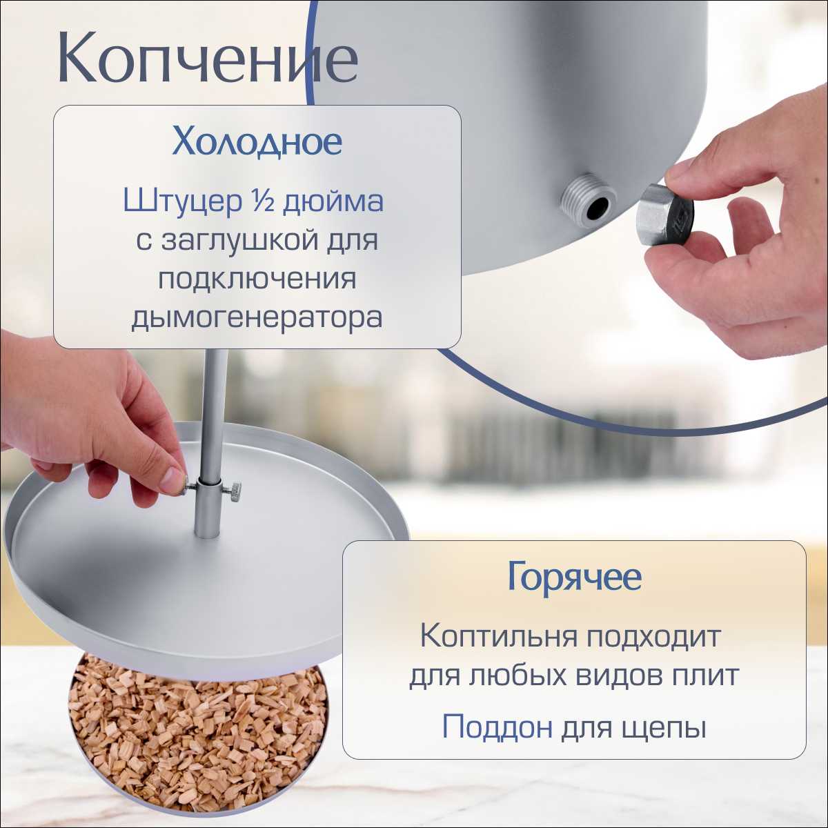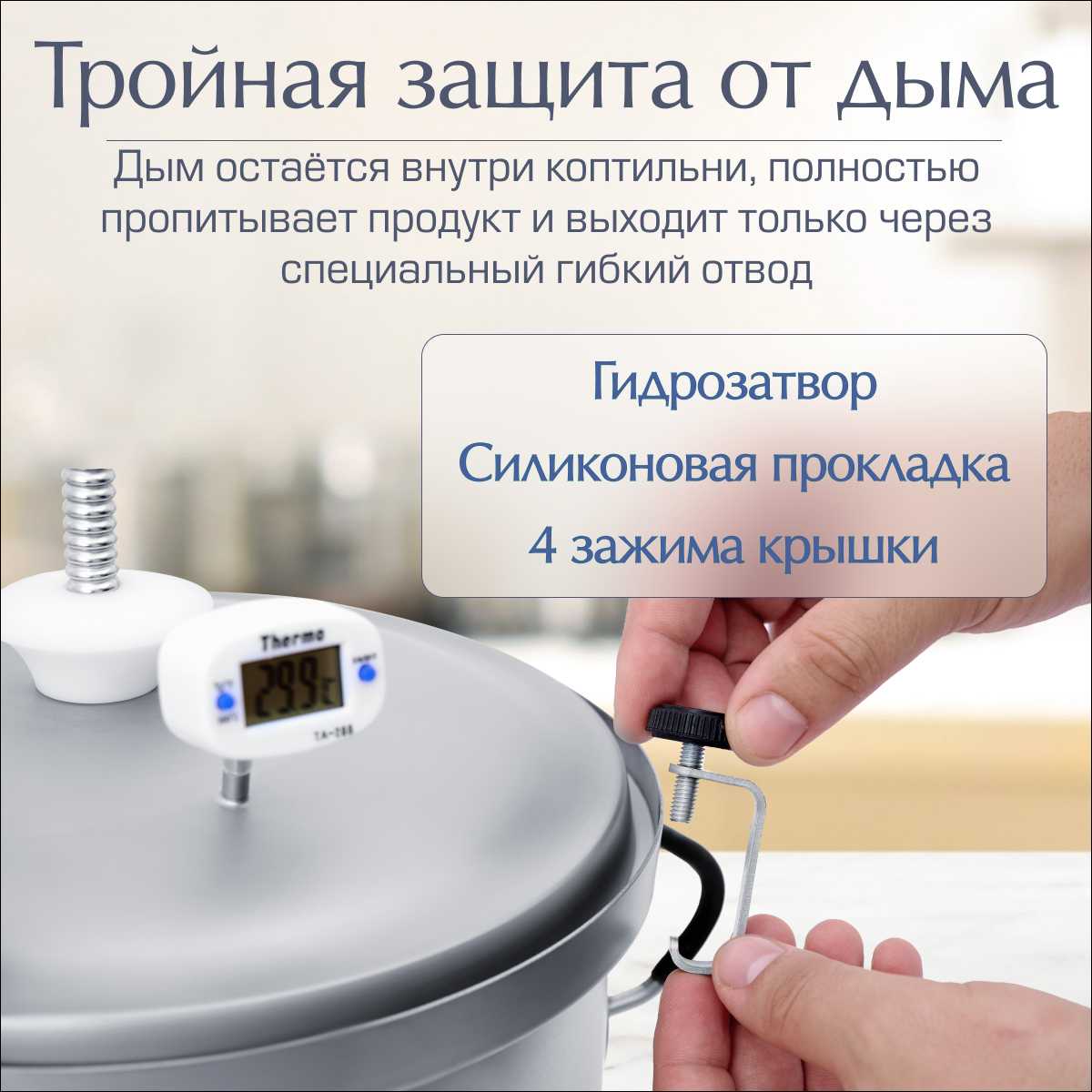 Особенности : | крышка, поддон для сбора жира, термометр |