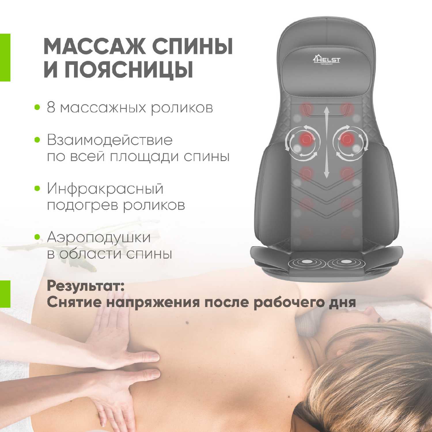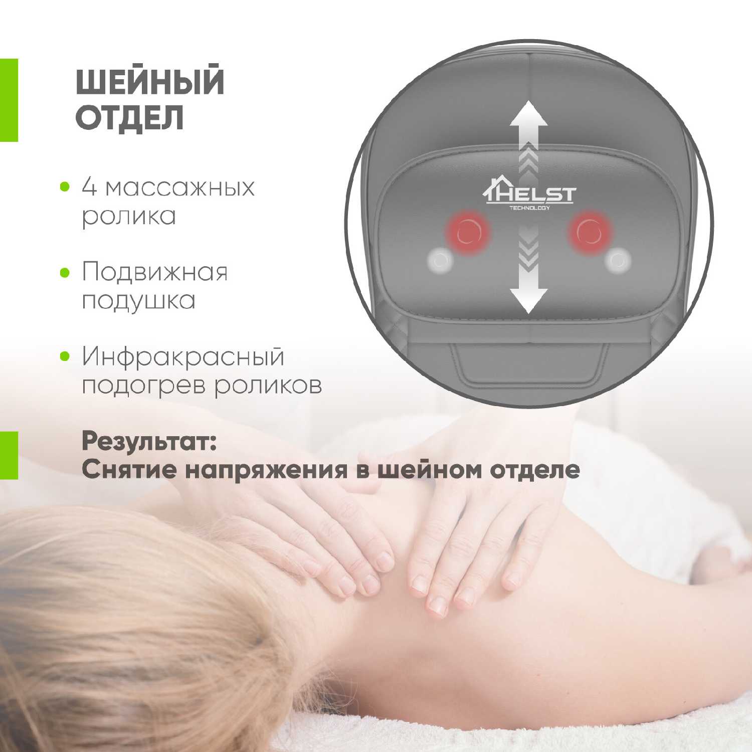 | Зона массажа : | плечи, поясница, спина, шея, ягодицы |