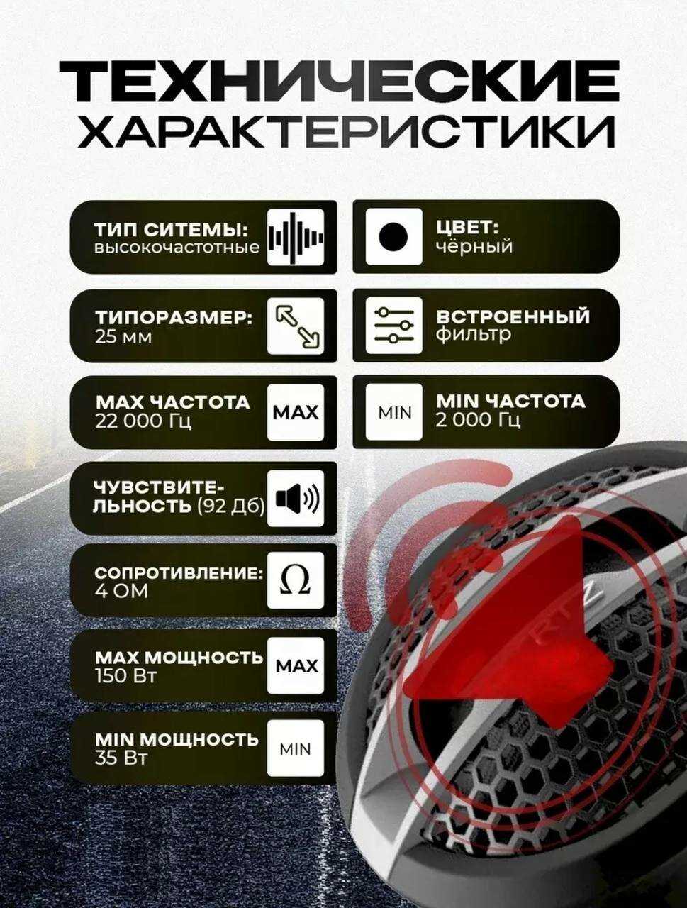 | Комплектация : | · Высокочастотные динамики - 2 шт. · Комплект креплений - 2 шт. · Кроссоверы - 2 шт. |